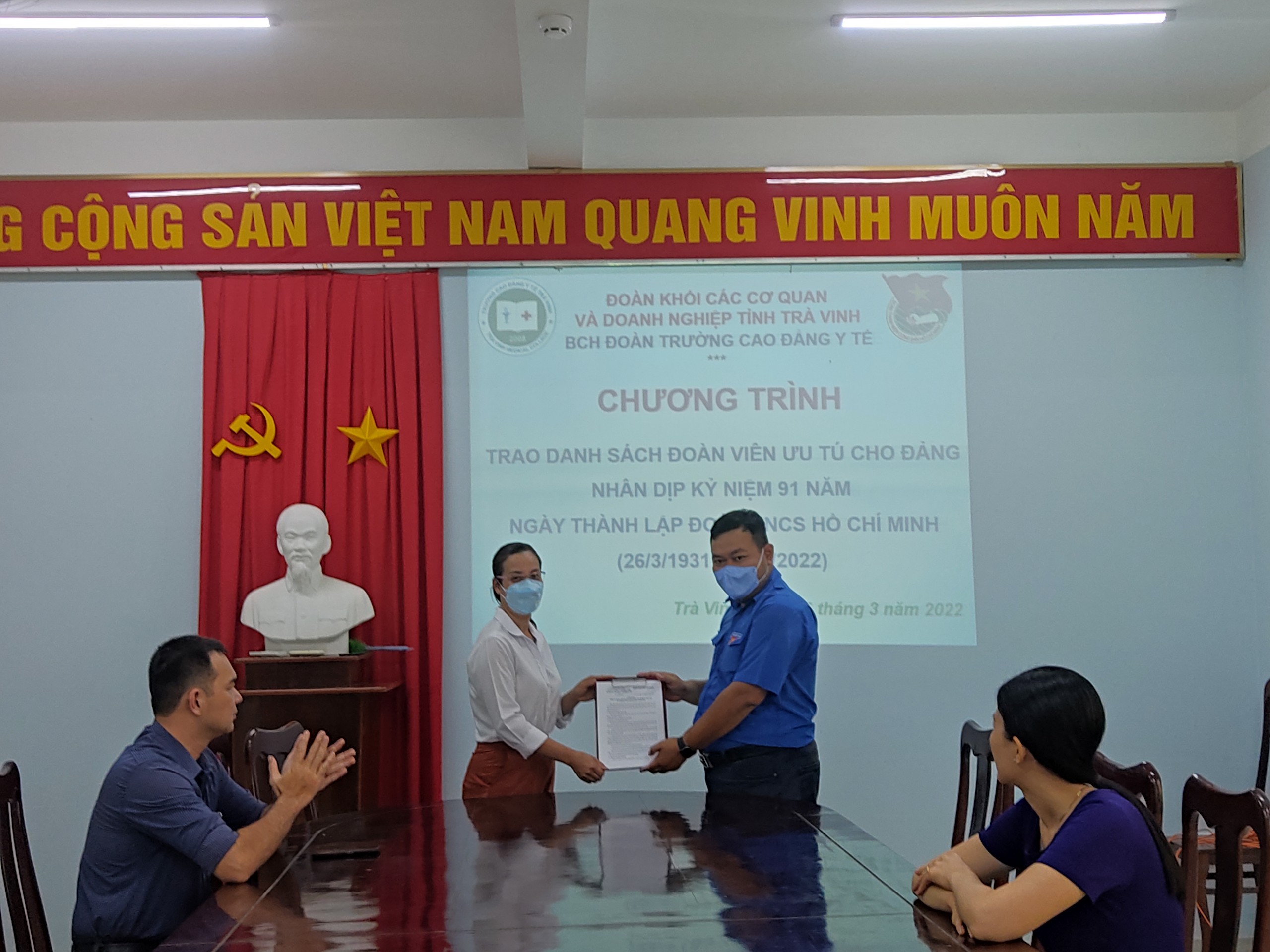 Đồng chí Nguyễn Phước Lộc – Bí thư Đoàn trường Cao đẳng y tế trao quyết định và chụp ảnh lưu niệm cùng đoàn viên ưu tú