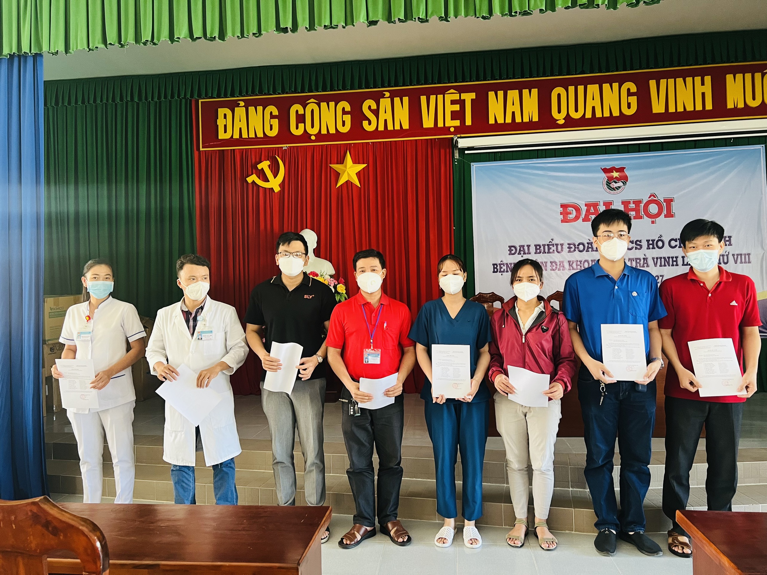 Đồng chí Lê Hoàng Nhã – Bí thư Đoàn cơ sở Bệnh viện Đa khoa Trà Vinh (thứ 4 trái qua) trao quyết định và chụp ảnh lưu niệm cùng đoàn viên ưu tú
