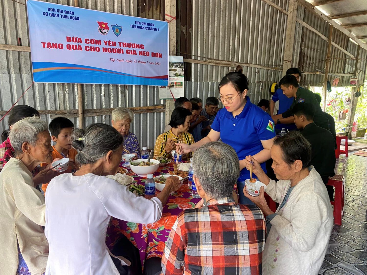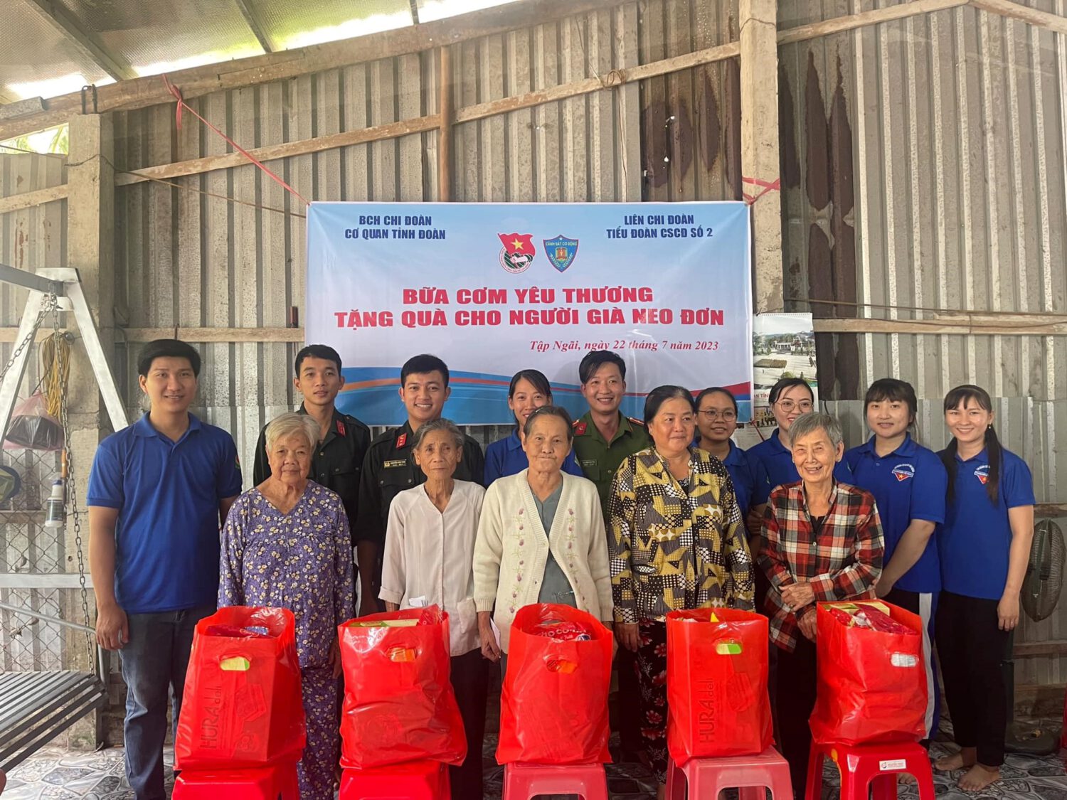 Dịp này, Đoàn đã phối hợp tổ chức “Bữa cơm yêu thương” cho 30 cụ gia neo đơn, gia đình chính sách, gia đình có hoàn cảnh khó khăn. Tại đây, đồng chí Lâm Nguyễn Duy Nhân – Bí thư Chi đoàn cơ quan Tỉnh đoàn đã ân cần thăm hỏi sức khỏe, trò chuyện với các cụ. Đồng thời, động viên các cụ cố gắng vượt qua mọi khó khăn, vươn lên trong cuộc sống. Dịp này, Đoàn đã trao tặng 10 phần quà cho 10 cụ già neo đơn thuộc diện chính sách với tổng kinh phí 5.000.000 đồng.