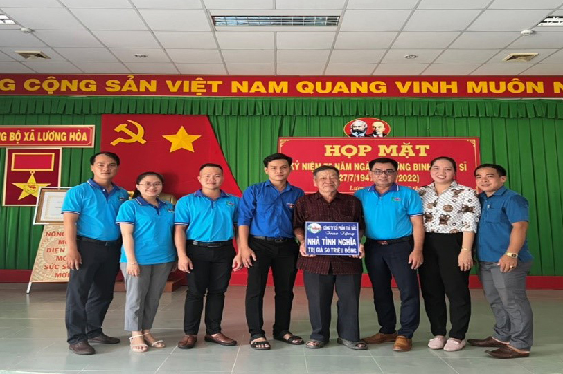 Nhân kỷ niệm 75 năm Ngày Thương binh – Liệt sĩ (27/7/1947 – 27/7/2022). Đảng ủy, BCH Chi đoàn Công ty Cổ phần Trà Bắc phối hợp với Ủy Ban Nhân Dân Xã Lương Hòa đã tiến hành trao tặng nhà tình nghĩa trị giá 50 triệu đồng cho ông Nguyễn Văn Dư ngụ ấp Ba Se B, xã Lương Hòa (huyện Châu Thành). Được biết ông Nguyễn Văn Dư là người hoạt động kháng chiến bị địch bắt tù đày, gia đình thuộc diện khó khăn về nhà ở.