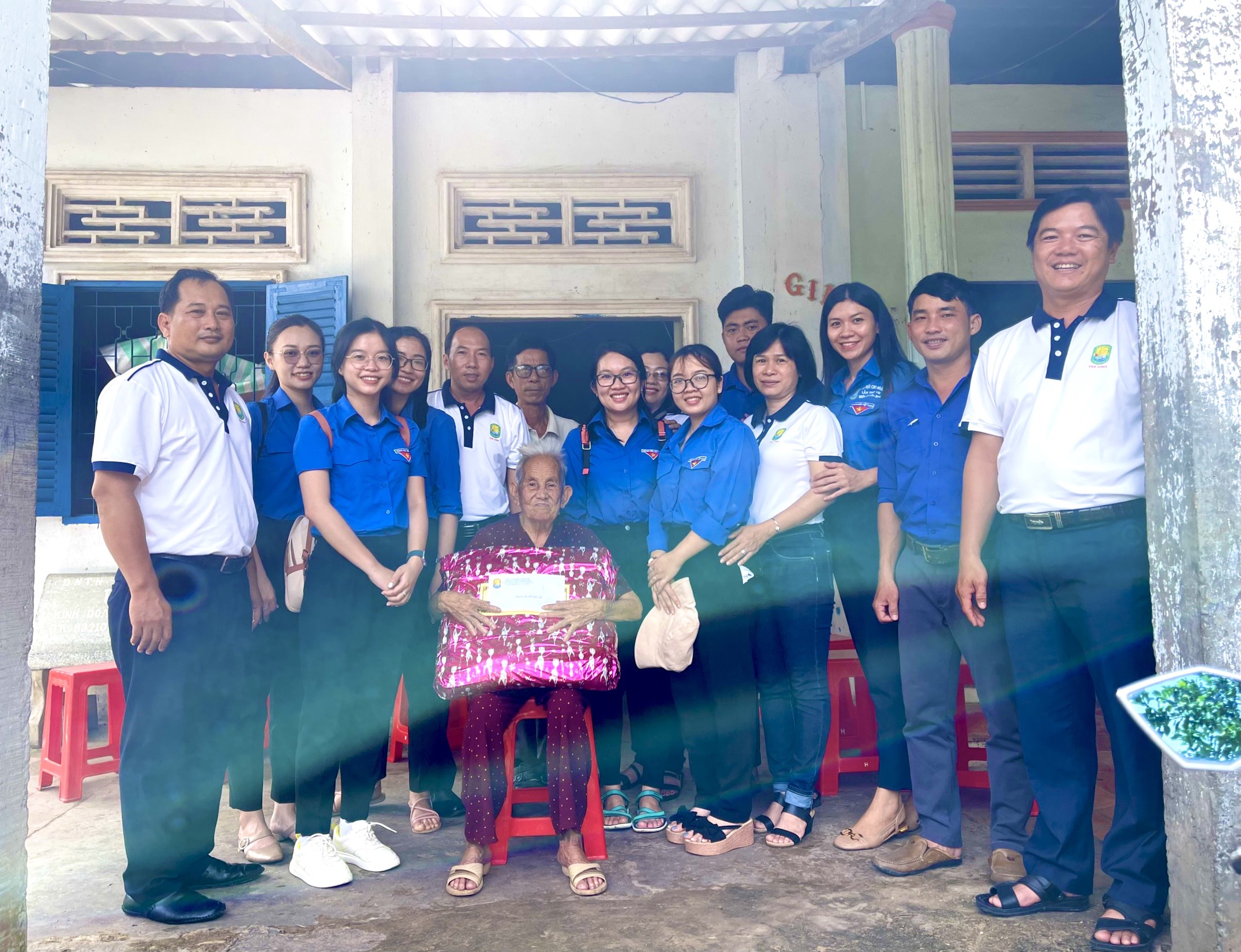 Chi đoàn chụp ảnh lưu niệm với Cựu Trần Thị Hai