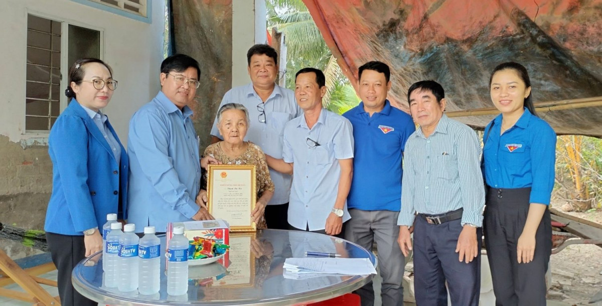 Đoàn trao tặng quà cho cụ bà ở huyện Cầu Kè