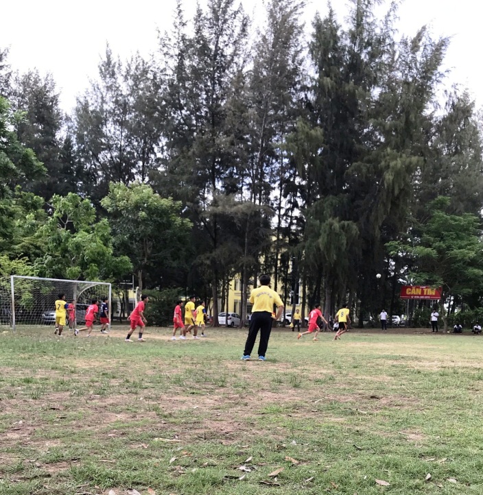 Sau khi trao cờ lưu niệm, các cầu thủ ra sân thi đấu, Chi đoàn Sở Nông nghiệp và Phát triển nông thôn trong trang phục màu đỏ, Công đoàn Trường đại học Trà Vinh trong trang phục màu vàng.