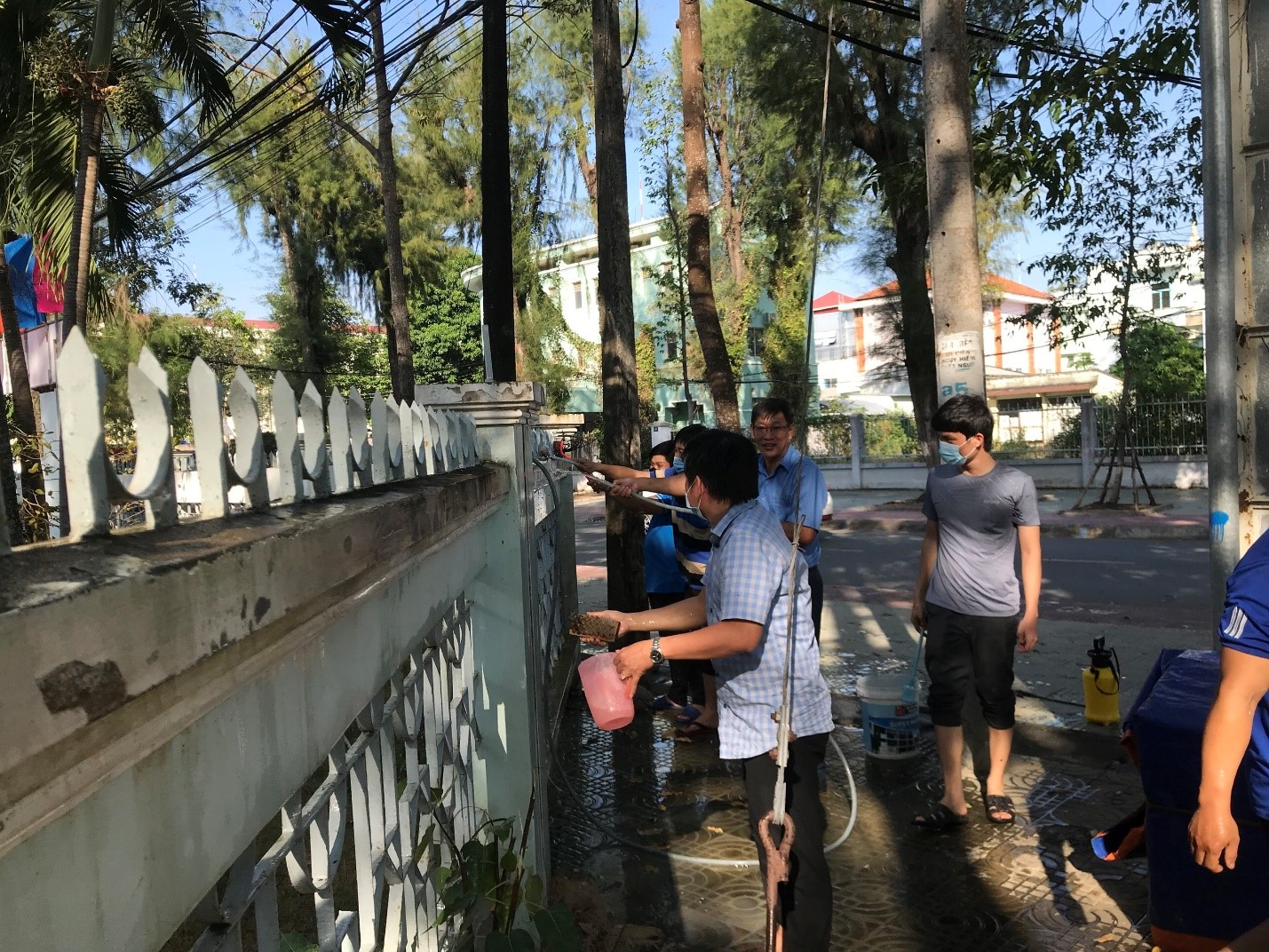 Đoàn viên chi đoàn vệ sinh hàng rào cơ quan