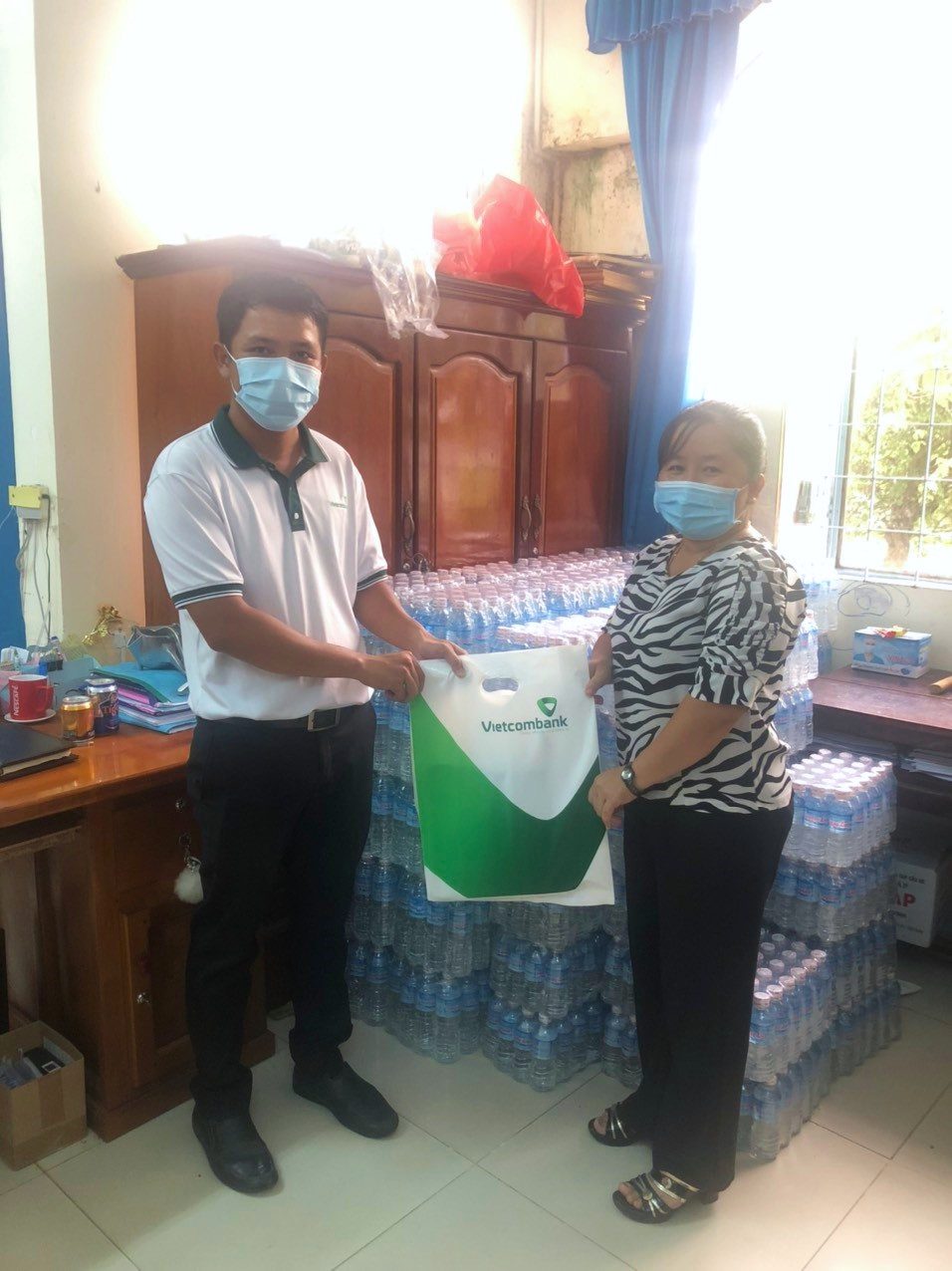Đồng chí Trần Thị Trúc, Chánh Văn phòng Huyện ủy huyện Tiểu Cần, tỉnh Trà Vinh tiếp nhận quà tặng 100 lốc nước đóng chai của Đoàn thanh niên VCB Trà Vinh