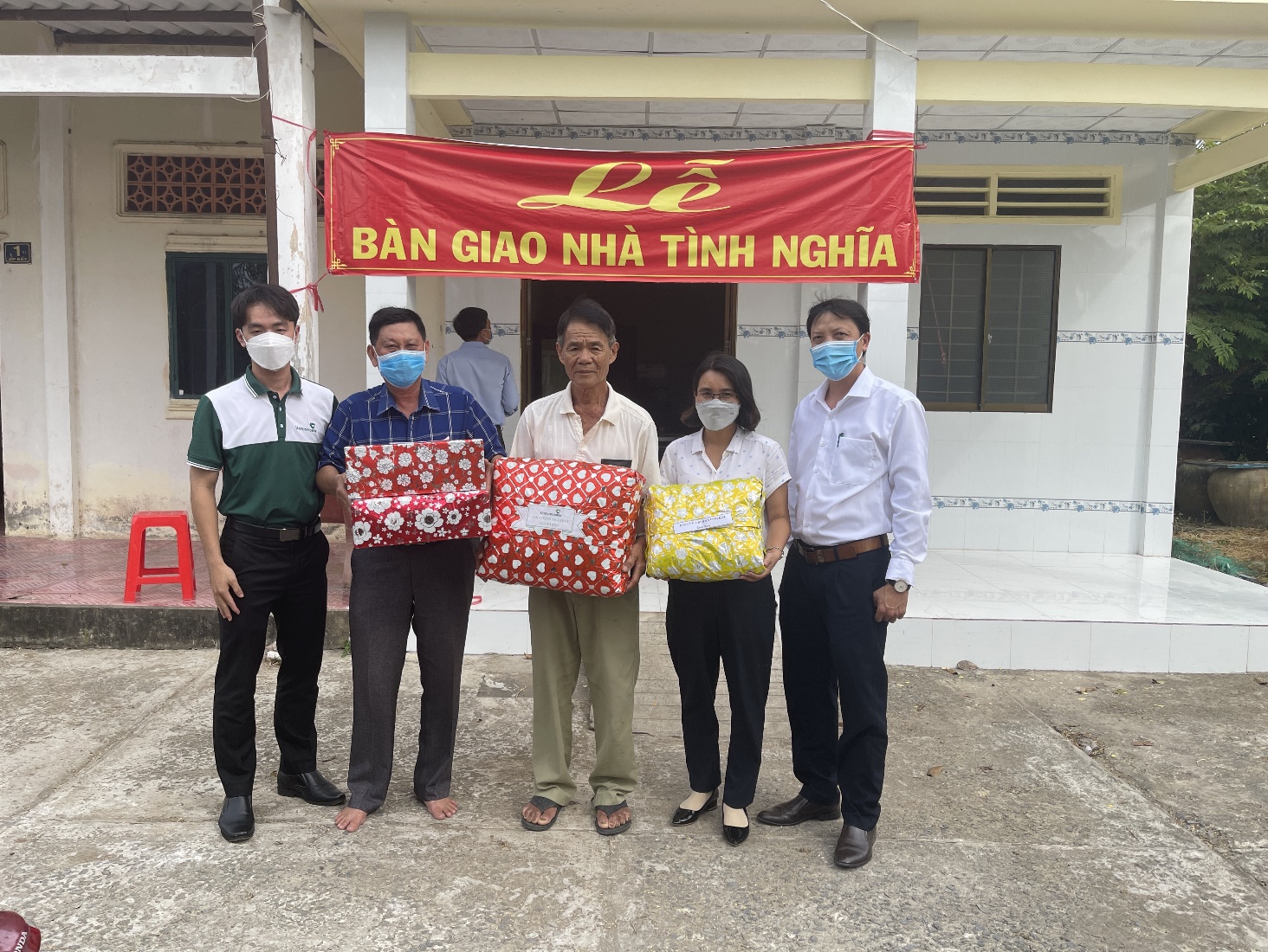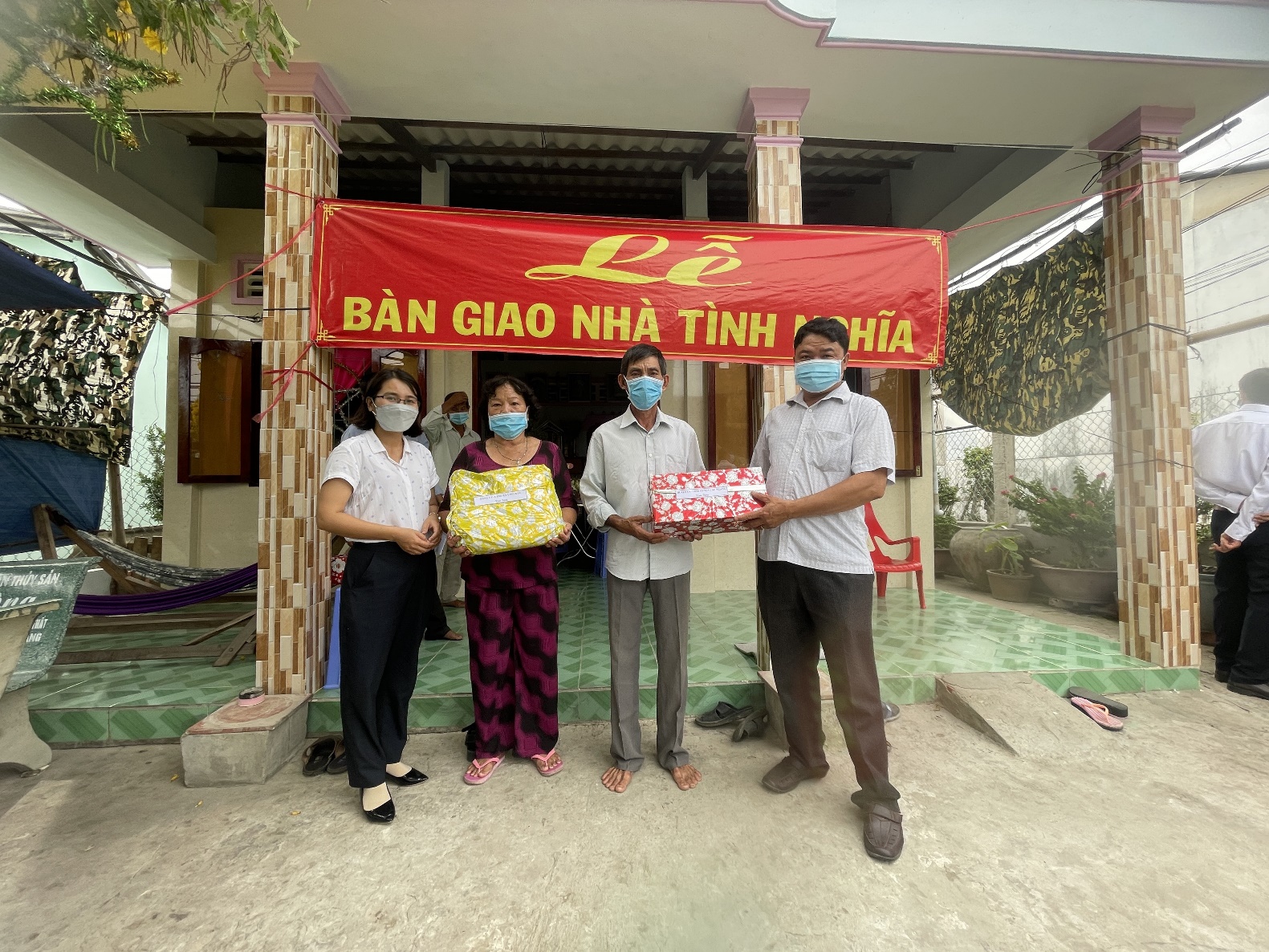Đồng chí Dương Thanh Nghĩa – Phó Chủ tịch Công đoàn (Bên phải) và đồng chí Cao Nguyễn Thúy Vy – Phó Bí thư Đoàn Thanh niên (Bên trái) trao tặng căn nhà tình nghĩa cho gia đình ông Phạm Văn Đổi – thương binh 4/4 tại ấp Cà Tum A, xã Vinh Kim, huyện Cầu Ngang, tỉnh Trà Vinh