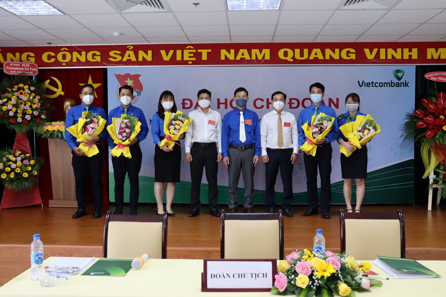 Đồng chí Dương Quốc Toàn – Phó Bí thư Đoàn khối Các cơ quan và Doanh nghiệp tỉnh Trà Vinh (bên trái ngoài cùng) và (Ông) Đỗ Thành Lý – Chủ tịch Công đoàn – Phó Giám đốc chi nhánh (bên phải ngoài cùng) tặng hoa chúc mừng Đoàn đại biểu dự Đại hội Đoàn cấp trên