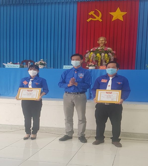 Đồng chí Nguyễn Trọng Nhân (phải) – Đảng ủy viên, UV.BTV Tỉnh đoàn, Bí thư Đoàn khối các cơ quan và doanh nghiệp tỉnh tặng bằng khen cho tập thể và cá nhân có thành tích xuất sắc trong phong trào công tác đoàn và phong trào thanh thiếu nhi nhiệm kỳ 2017 – 2022