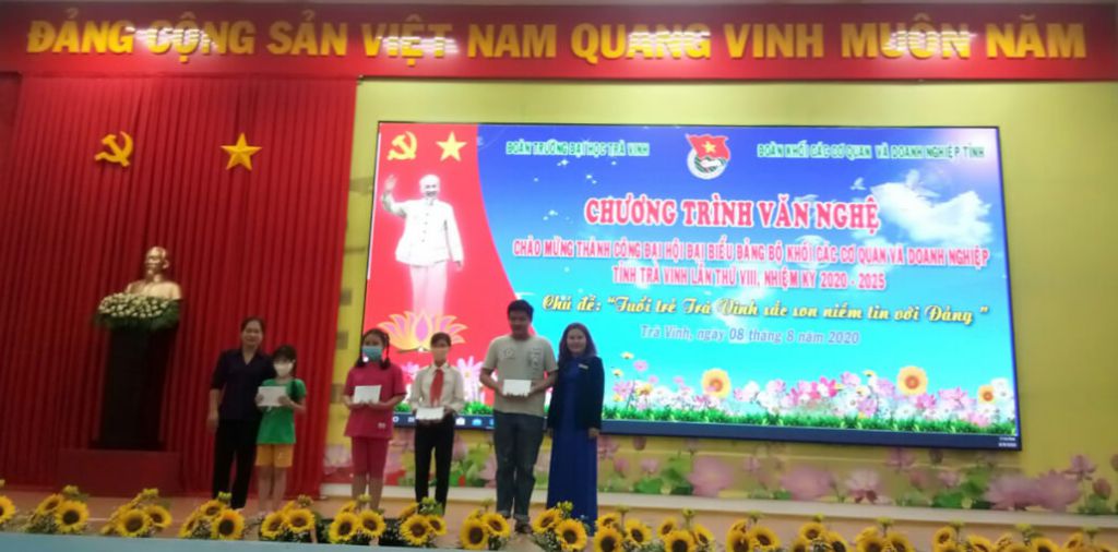 Tại đêm văn nghệ, Ban Thường vụ Đoàn khối các cơ quan và doanh nghiệp tỉnh trao 10 suất học bổng, mỗi suất trị giá 500.000đ  cho các em học sinh có hoàn cảnh khó khăn trên địa bàn thành phố Trà Vinh (nguồn do Công ty Bảo hiểm Nhân thọ MB Ageas Life chi nhánh Trà Vinh hỗ trợ).