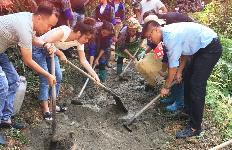 Sau lễ khởi công, đoàn viên thanh niên và người dân cũng như đoàn thiện nguyện đã bắt tay ngay vào làm tuyến đường của bản Nả Háng. Tôi hỏi chị Lại Phương Lan – Giám đốc Trung tâm thẩm mỹ Lại Lan Trang, người rất có tâm trong các chương trình tình nguyện cũng là người kết nối các tấm lòng hảo tâm để ủng hộ 80 tấn xi măng để làm con đường này: “Chị thấy chuyến đi thế nào?”. Vừa cùng người dân san gạt bê tông trên mặt đường chị trả lời: “Đây là chuyến đi ý nghĩa của cá nhân chị cũng như của cả đoàn, đúng là làm ra một con đường bê tông ở nơi đây, máy móc không vào được, toàn bộ phải làm bằng sức người thế này quả thật quá khó khăn, và đúng là: chẳng thể  đong đếm được con đường này trị giá bao nhiêu tiền… rất may đoàn đã vận động kịp để phối hợp với Hội Đồng đội – Tỉnh đoàn Yên Bái làm con đường này cho các em đi học, người dân giao thương đỡ vất vả, cũng rất vinh dự cho đoàn khi biết công trình này nằm trong cụm công trình “Con đường em đến trường” để chào mừng Đại hội Đảng bộ tỉnh Yên Bái lần thứ XIX.”