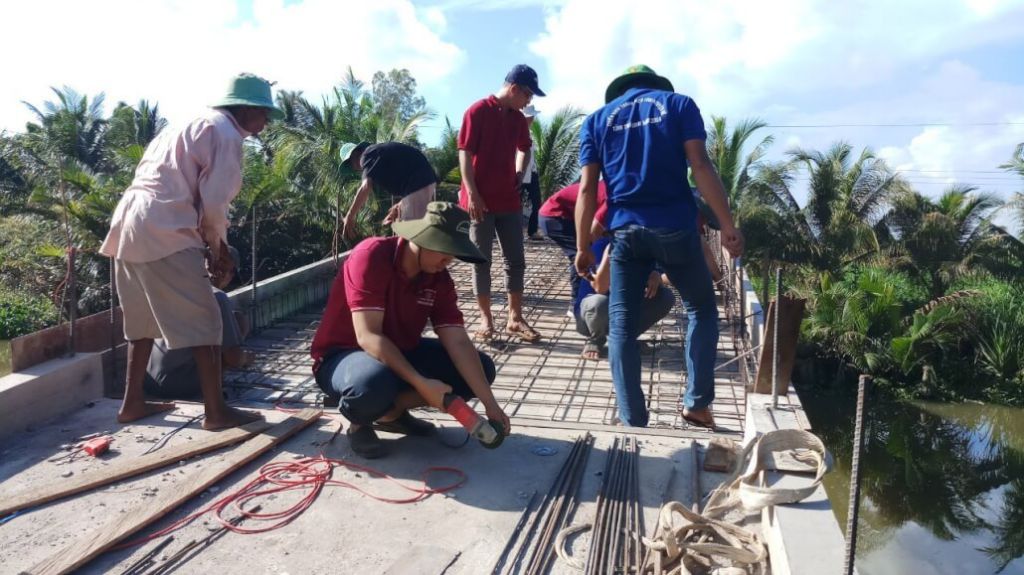 3/ Phối hợp với Huyện đoàn Càng Long thực hiện 01 công trình thắp sáng đường quê với chiều dài 2km, kinh phí 35 triệu đồng tại xã Bình Phú; Hỗ trợ người dân cắt sắt, lót nhựa và đổ móng cầu giao thông nông thôn với chiều dài 45 mét tại xã Huyền Hội (hình 3 và hình 4)