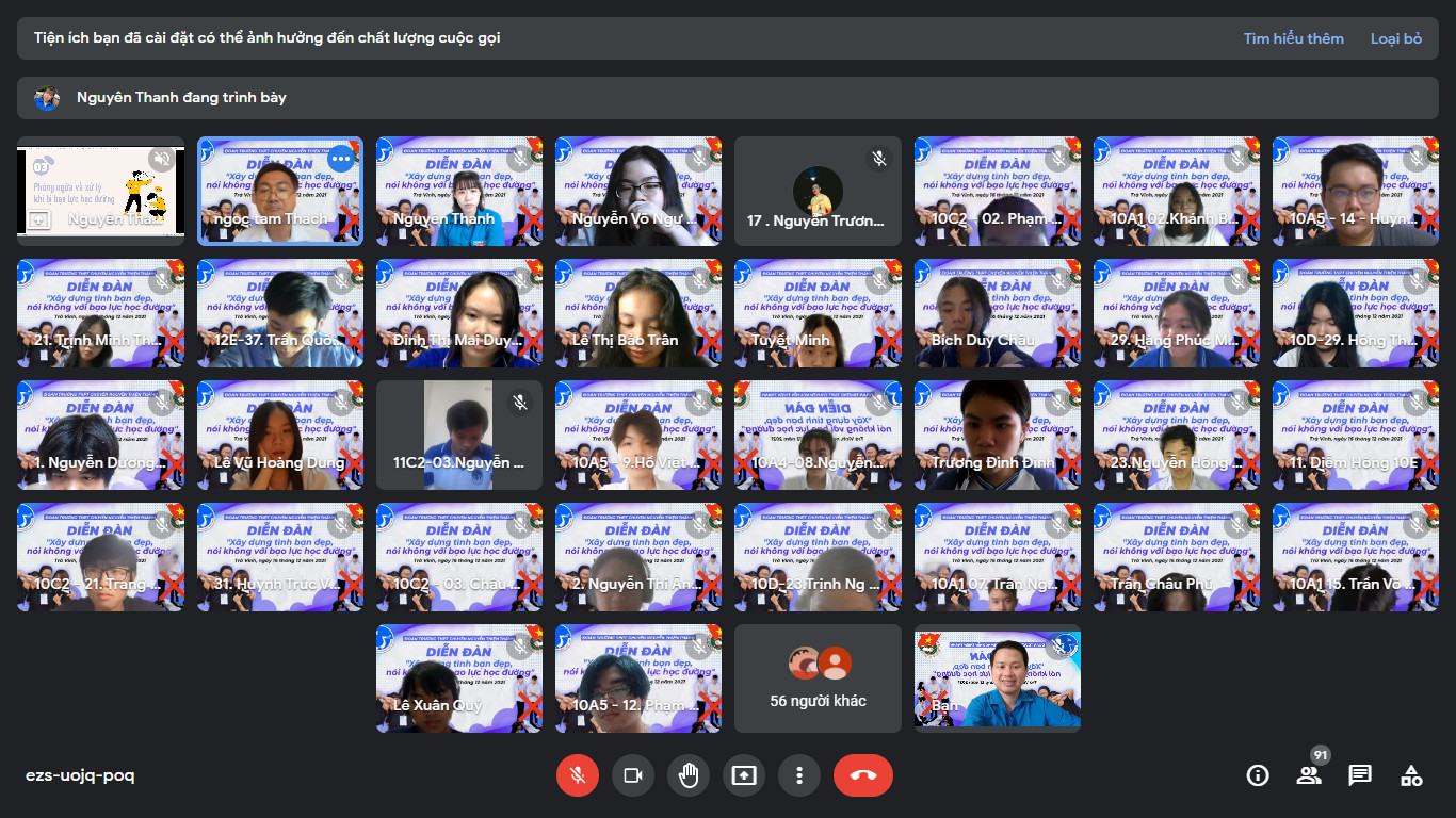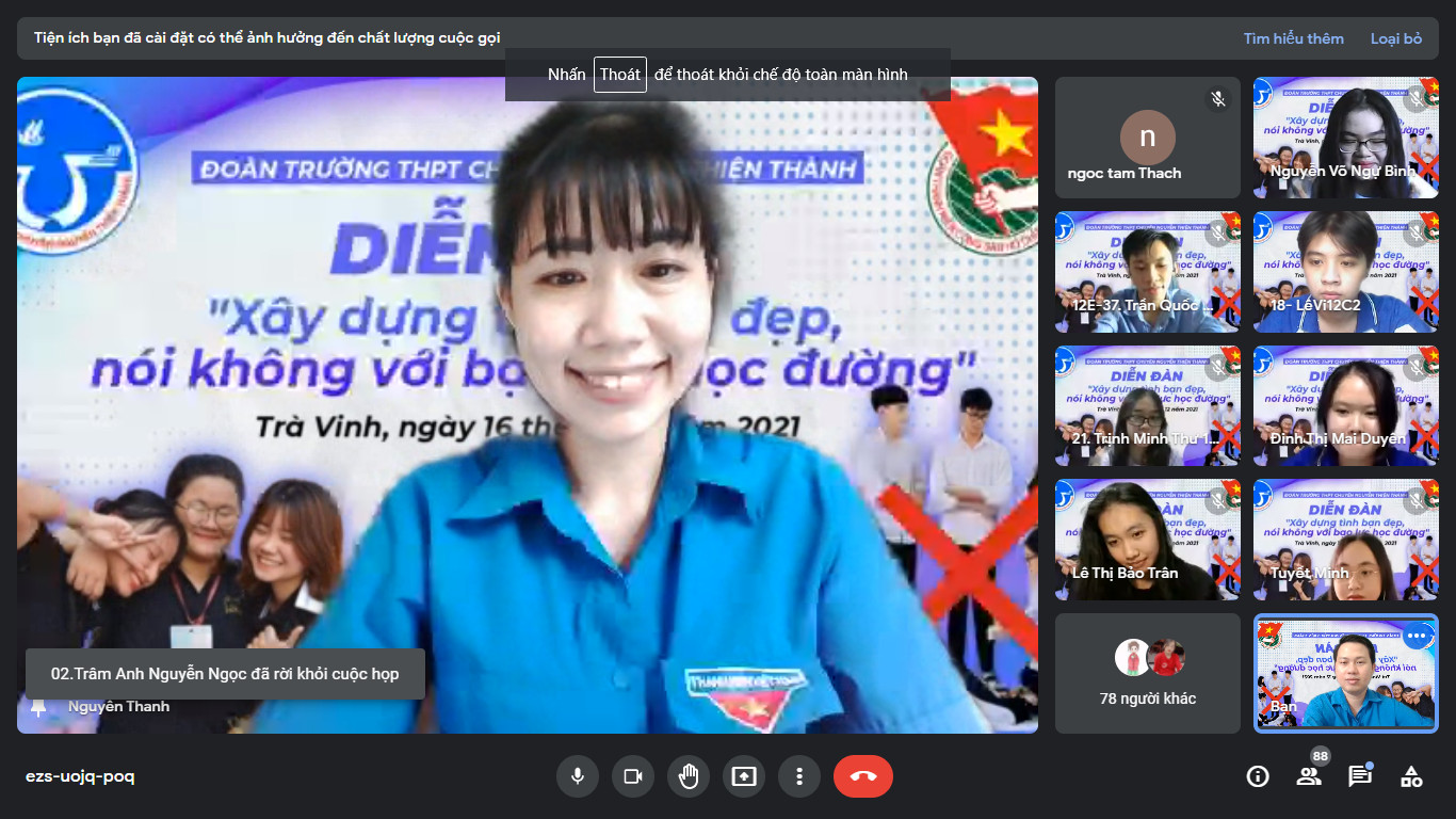 Nhằm giáo dục cho các em học sinh hiểu được vai trò và ý nghĩa của tình bạn trong môi trường học tập cũng như trong cuộc sống. Ngày 16/12/2021, Đoàn trường THPT Chuyên Nguyễn Thiện Thành đã tổ chức diễn đàn “Xây dựng tình bạn đẹp – nói không với bạo lực học đường” thu hút sự tham gia của trên 90 đoàn viên thanh niên của trường.