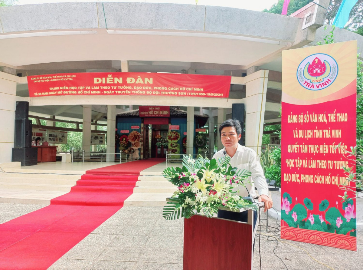Chiều ngày 19/5/2024, tại khu di tích lịch sử Đền thờ Chủ tịch Hồ Chí Minh, (ấp Vĩnh Hội, xã Long Đức, thành phố Trà Vinh). Đoàn cơ sở Sở Văn hóa, Thể thao và Du lịch phối hợp Chi bộ Thư viện tỉnh Trà Vinh tổ chức Diễn đàn “Thanh niên học tập và làm theo tư tưởng, đạo đức phong cách Hồ Chí Minh”. Tham dự có đồng chí Lâm Hữu Phúc – BTV Đảng ủy, Phó Giám đốc Sở; đồng chí Lâm Xuân Quang – Hội Cựu chiến binh, các đồng chí Bí thư, Phó Bí thư các Chi bộ và đoàn viên thanh niên trực thuộc Đoàn cơ sở cùng tham dự.