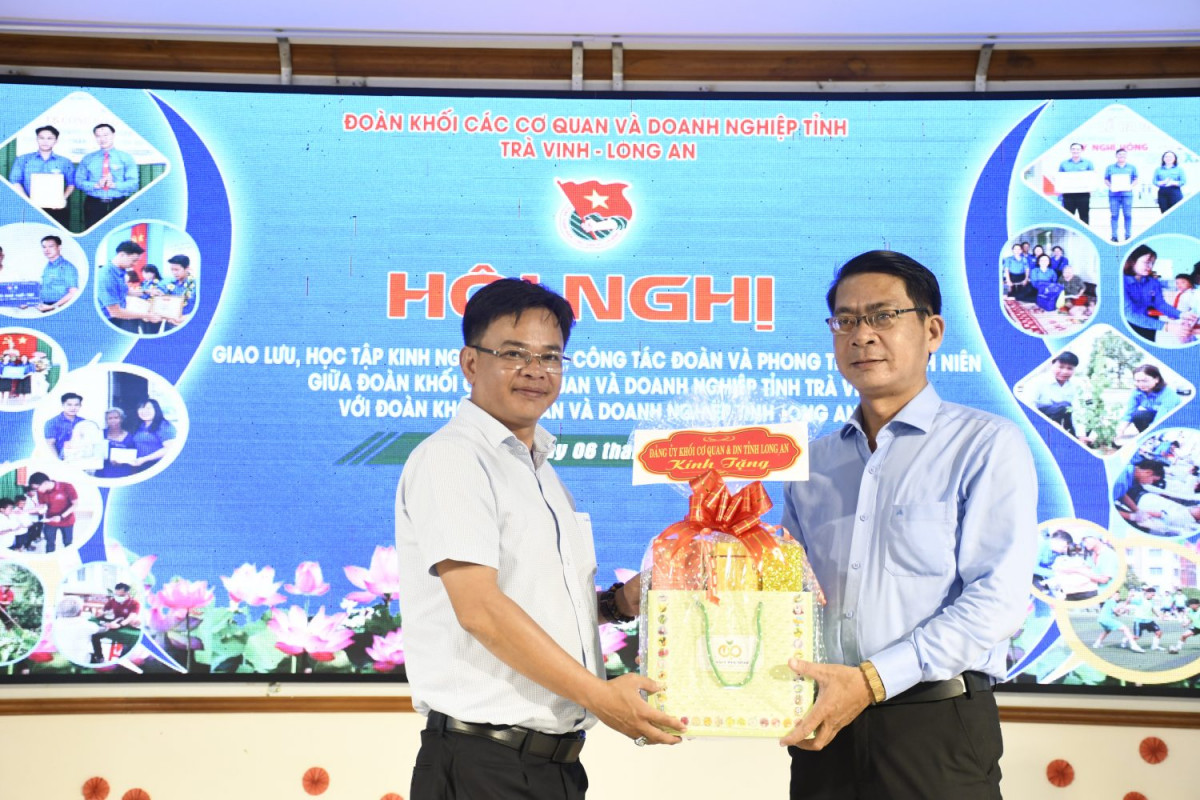 Đồng chí Nguyễn Trọng Nhân (phải) – Đảng ủy viên, UVTV Tỉnh Đoàn, Bí thư Đoàn Khối các CQ-DN tỉnh Trà Vinh trao tặng quà cho Đoàn khối CQ-DN tỉnh Long An