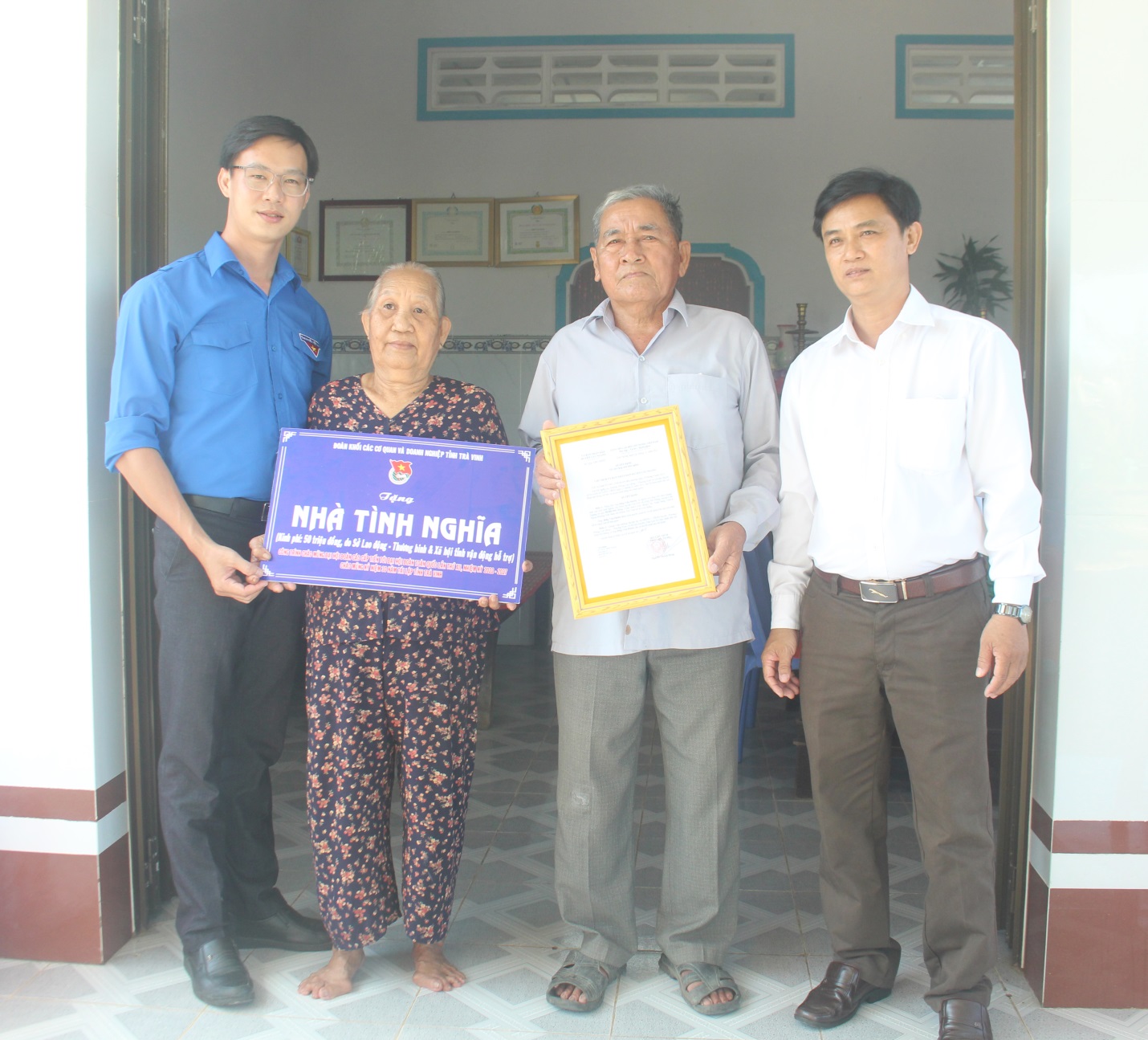Đồng chí Nguyễn Trọng Nhân – Bí thư Đoàn khối các cơ quan và doanh nghiệp (trái) và Đồng chí Trần Thái Phong – Huyện ủy Viên, Bí thư Đảng ủy Xã Hiệp Mỹ Đông (phải) trao bảng tượng trưng, quyết định bàn giao nhà và chụp ảnh lưu niệm cùng gia đình