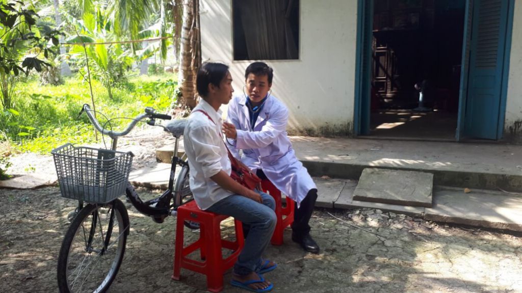 (Bác Sĩ Lê Hoàng Nhã thăm khám cho anh Phúc tại căn nhà riêng của anh tại ấp Ba Se A, xã Lương Hòa)