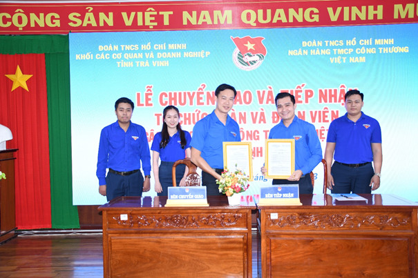 Tại buổi lễ, đồng chí Nguyễn Trọng Nhân – Đảng ủy viên, UVBTV Tỉnh đoàn, Bí thư Đoàn khối các cơ quan và doanh nghiệp tỉnh cùng với lãnh đạo Đoàn Thanh niên Ngân hàng Ngoại thương Việt Nam; Đoàn Thanh niên Ngân hàng Nông nghiệp & PTNT Việt Nam; Đoàn Thanh niên Ngân hàng Công thương Việt Nam tiến hành ký biên bản chuyển giao và tiếp nhận 03 tổ chức cơ sở Đoàn với 82 đoàn viên thanh niên (Trước đó ngày 28/3/2023, Đoàn khối đã tiến hành chuyển giao Chi đoàn Ngân hàng TMCP Đầu tư và Phát triển Việt Nam – Chi nhánh Trà Vinh (BIDV) với 19 đoàn viên).