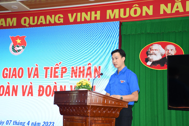 Đồng chí Nguyễn Trọng Nhân – Đảng ủy viên, UVBTV Tỉnh đoàn, Bí thư Đoàn khối phát biểu tại buổi lễ chuyển giao, tiếp nhận tổ chức đoàn và đoàn viên