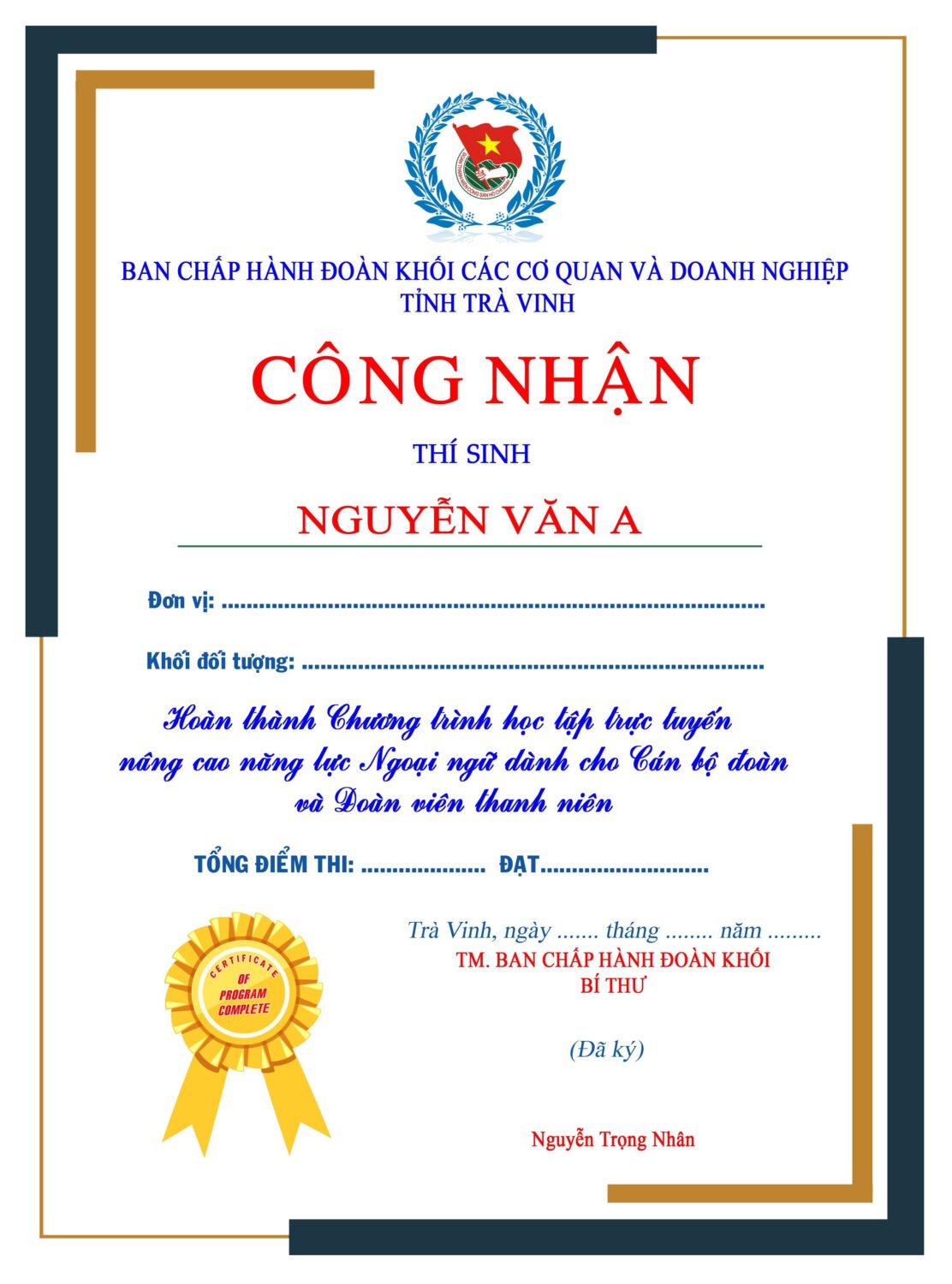 Mẫu giấy Công nhận của BCH Đoàn khối