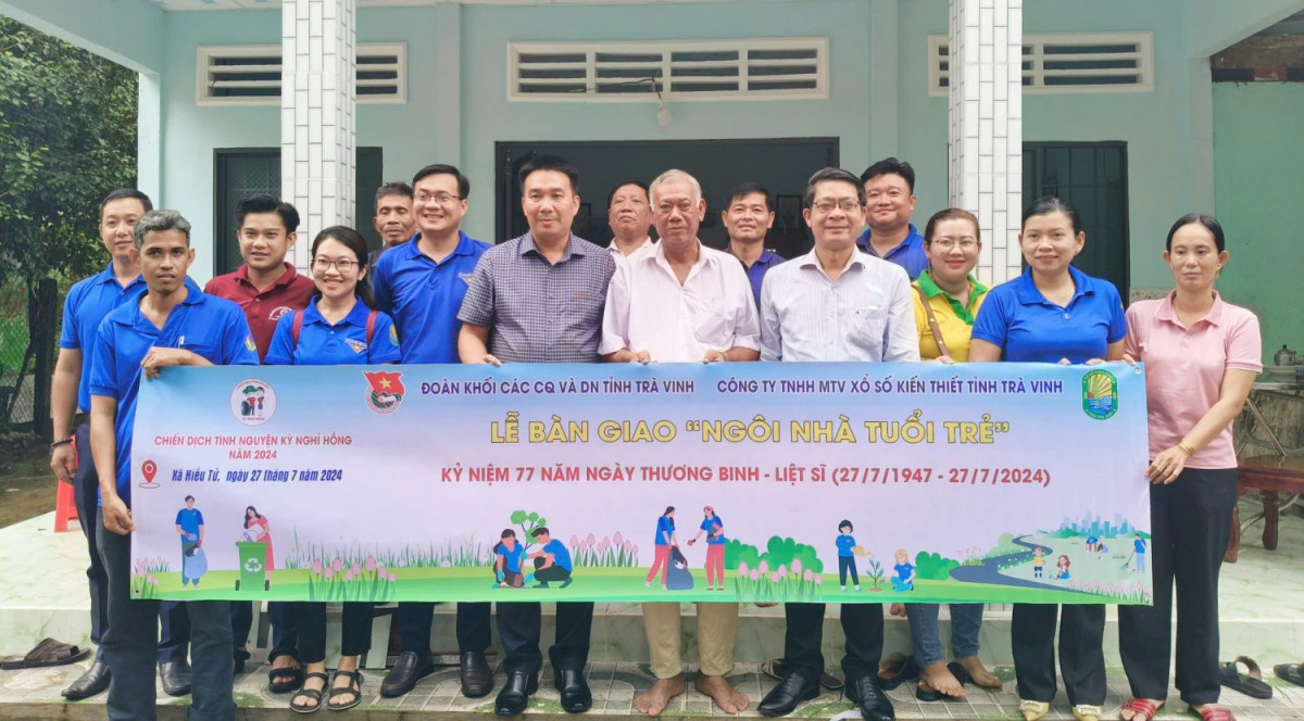 Bên cạnh đó, sáng ngày 27/7/2024 Ban Thường vụ Đoàn khối phối hợp với Đảng ủy – UBND Xã Hiếu Tử, huyện Tiểu Cần tổ chức ra quân đợt 3 chiến dịch tình nguyện Kỳ nghỉ hồng, tại đây các chiến sỹ đã thắp hương nhà bia tưởng niệm của xã và trao tặng 10 phần quà cho gia đình chính sách, gia đình có công với cách mạng (mỗi phần trị giá 500.000đ); bàn giao 01 căn “Ngôi nhà tuổi trẻ – căn số 11“ cho hộ gia đình ông Kim Thone với tổng kinh phí 60.000.000 đồng (trong đó: Đoàn khối vận động Công ty TNHH MTV Xổ số Kiến thiết Trà Vinh 50.000.000 đồng và Công ty TNHH Trần Thạch Cao Tân Huỳnh Phát hỗ trợ bộ la phông trị giá 10 triệu đồng).