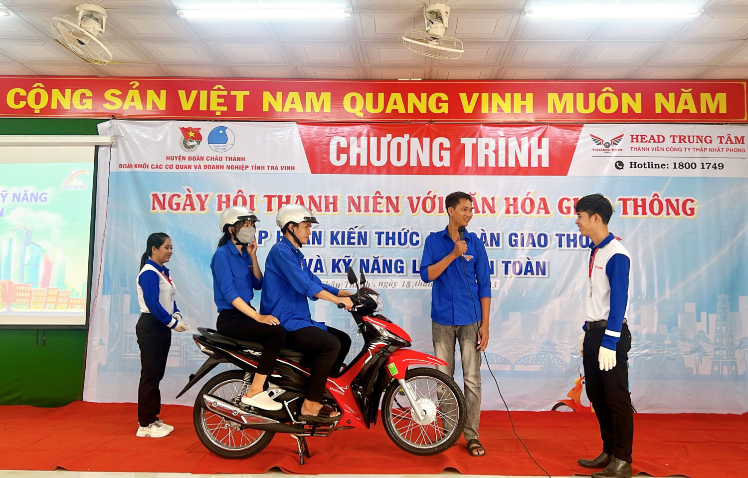 Tại đây các bạn đoàn viên thanh niên được đồng chí Nguyễn Quốc Nhiệm – cán bộ đội Cảnh sát giao thông hướng dẫn cách điều khiển an toàn khi tham gia giao thông, một số quy định khi tham gia giao thông đường bộ như: tìm hiểu nội dung một số biển báo giao thông, đi đúng làn đường quy định, các mức quy định xử phạt, các tình huống xử phạt khi tham gia giao thông. Ngoài ra, các bạn đoàn viên thanh niên còn được chị Thạch Thị Hoàng Oanh – Cửa hàng trưởng Head Trung tâm 5 hướng dẫn cách đội nón bảo hiểm đúng cách, tư thế khi tham gia giao thông và một số kiến thức, kỹ năng lái xe an toàn.