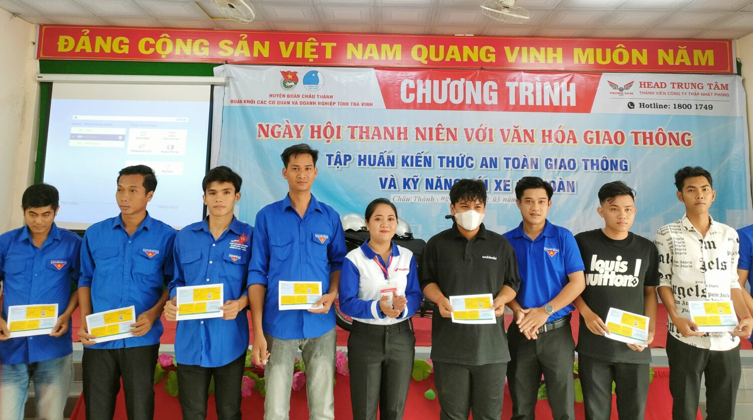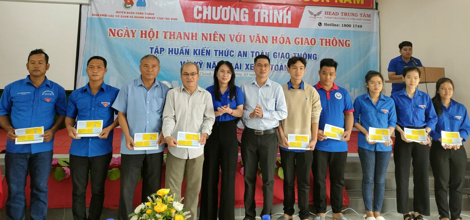 Đồng chí Lê Minh Thư – Bí thư Huyện đoàn Châu Thành và Anh Trần Minh Điện – Giám đốc điều hành và phát triển kinh doanh tỉnh Trà Vinh trao bảo hiểm xe cho đoàn viên thanh niên