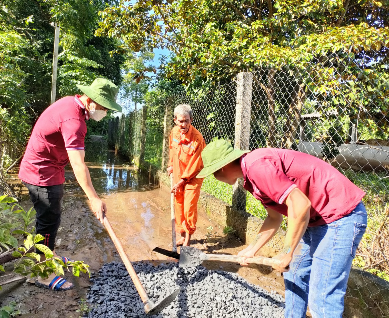 Chiến sỹ tình nguyện “Kỳ nghỉ hồng” thực hiện rãi đá nâng cấp đường giao thông nông thôn