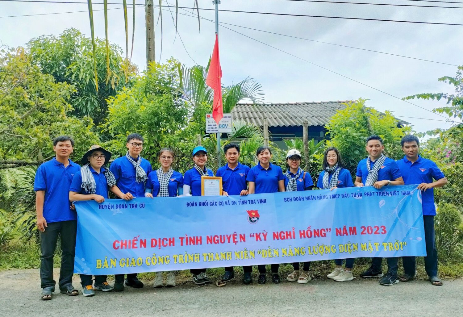 Lãnh đạo chụp ảnh lưu niêm tại lễ bàn giao Công trình thanh niên “Đèn năng lượng điện mặt trời” tại xã Long Hiệp, huyện Trà Cú