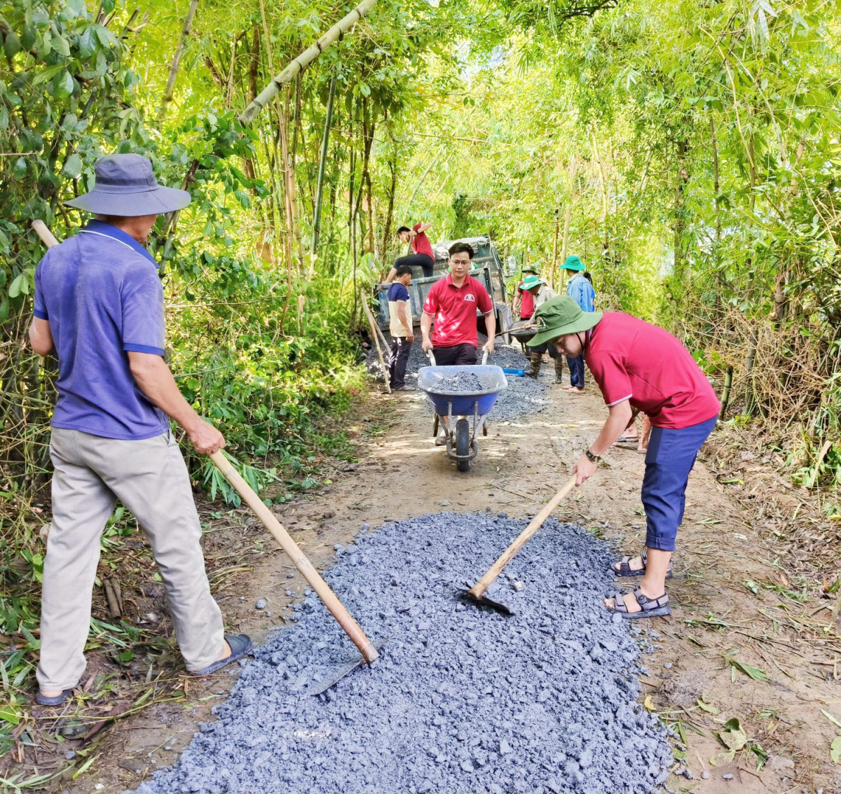 Chiến sĩ tham gia rãi đá đường giao thông nông thôn