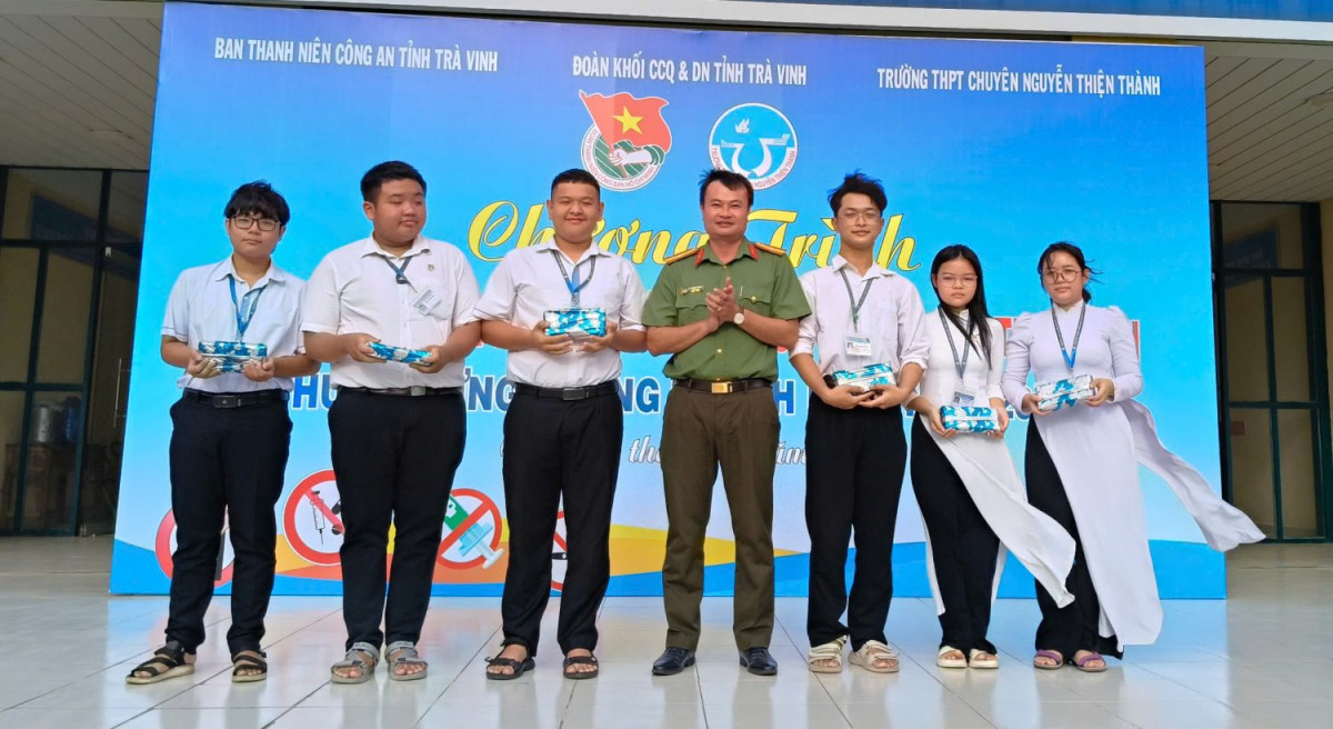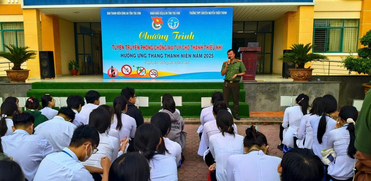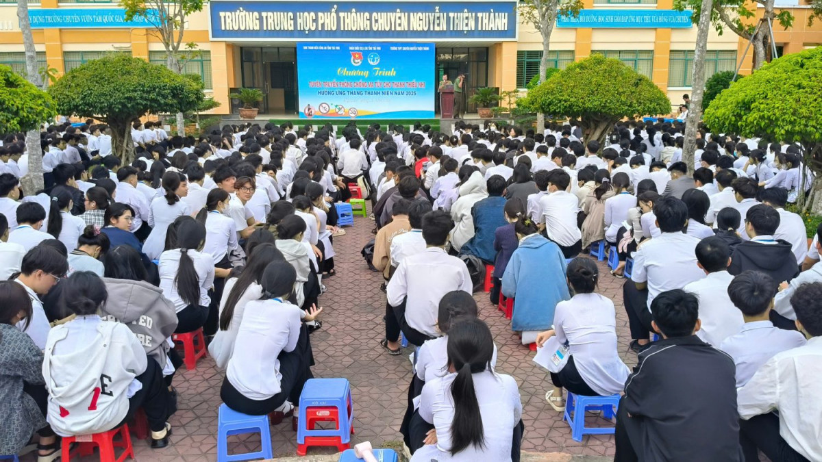 Sáng ngày 24/02/2025, tại Đoàn trường THPT Chuyên Nguyễn Thiện Thành Trà Vinh. Ban Thường vụ Đoàn khối phối hợp với Ban Thanh niên Công an tỉnh, trường THPT Chuyên Nguyễn Thiện Thành tổ chức chương trình tuyên truyền phòng chống ma túy cho thanh thiếu nhi. Tham dự chương trình có thầy Nguyễn Quốc Phong – Hiệu trưởng nhà trường; cô Lâm Quế Chi – Phó hiệu trưởng nhà trường; đồng chí Lý Thanh Trung – UVBTV tỉnh Đoàn, Trưởng ban Thanh niên Công an tỉnh; cùng các đồng chí trong tổ tuyên truyền pháp luật và trên 800 đoàn viên, thanh niên là học sinh của trường cùng tham dự.