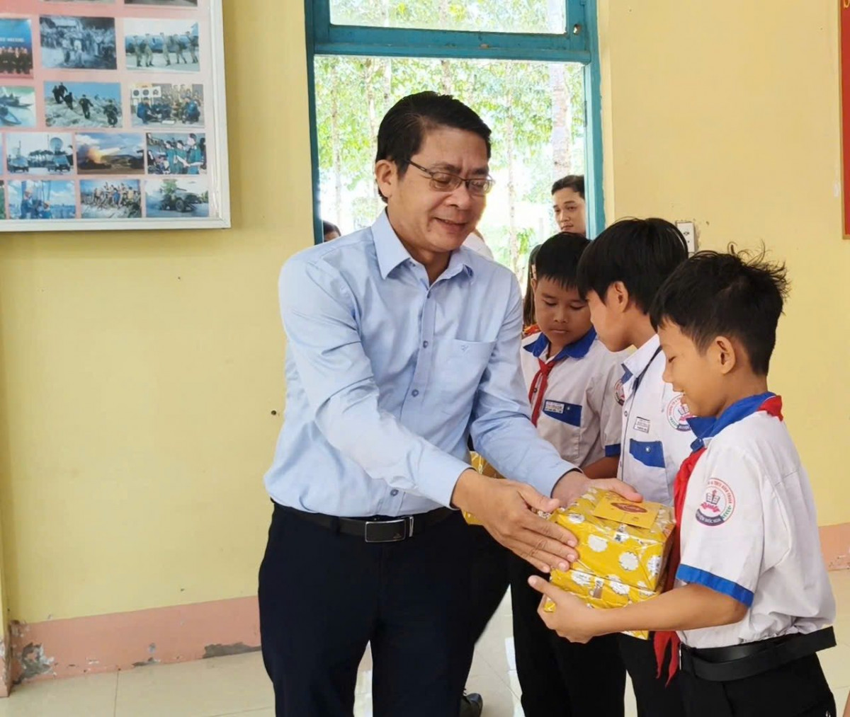Đồng chí Lữ Công Tạo (phải) – Phó Bí thư Đảng ủy khối các cơ quan và doanh nghiệp tỉnh Trà Vinh và đồng chí Phạm Huy Sơn (trái) – Bí thư Đảng ủy khối cơ quan và doanh nghiệp tỉnh Long An tặng quà cho các em học sinh có hoàn cảnh khó khăn