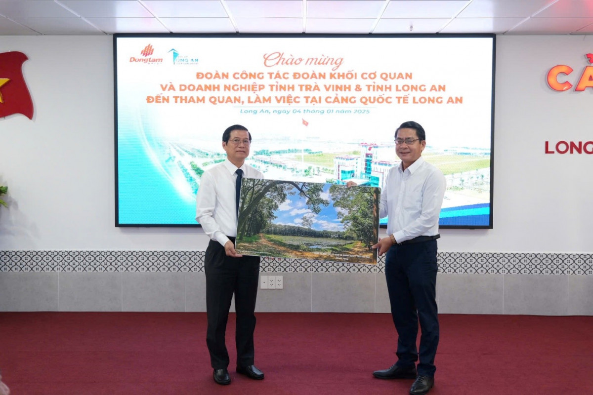 Đồng chí Lữ Công Tạo (phải) – Phó Bí thư Đảng ủy khối các cơ quan và doanh nghiệp tỉnh Trà Vinh tặng quà cho Ban Giám đốc Cảng quốc tế Long An