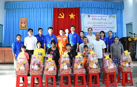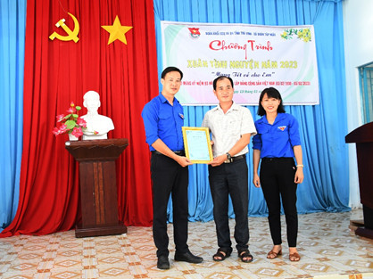 Đồng chí Nguyễn Trọng Nhân, Bí Thư Đoàn khối và đồng chí Trần Thị Diệu Hiền – Bí thư Xã đoàn Tập Ngãi trao quà Tết cho các em học sinh