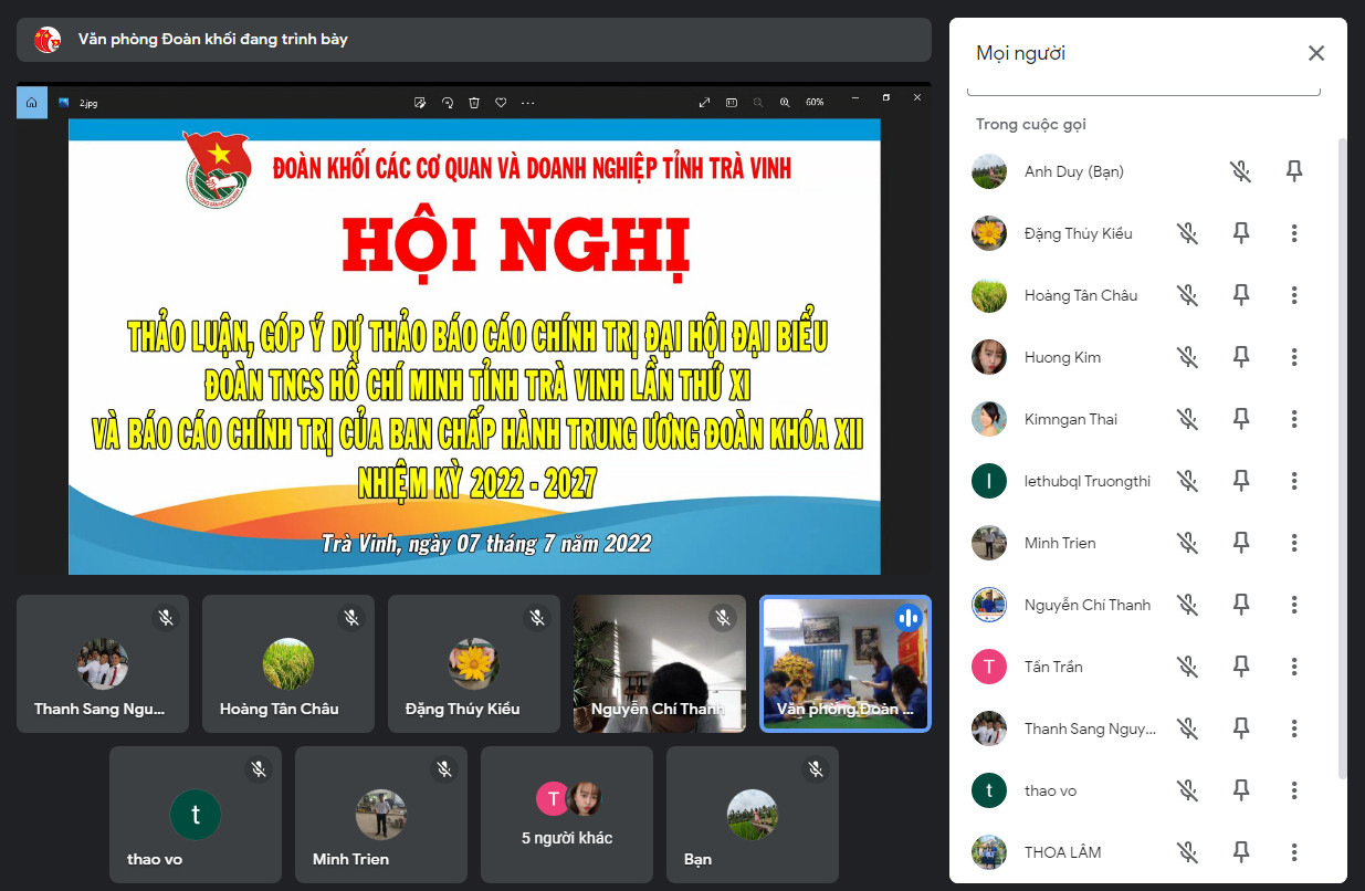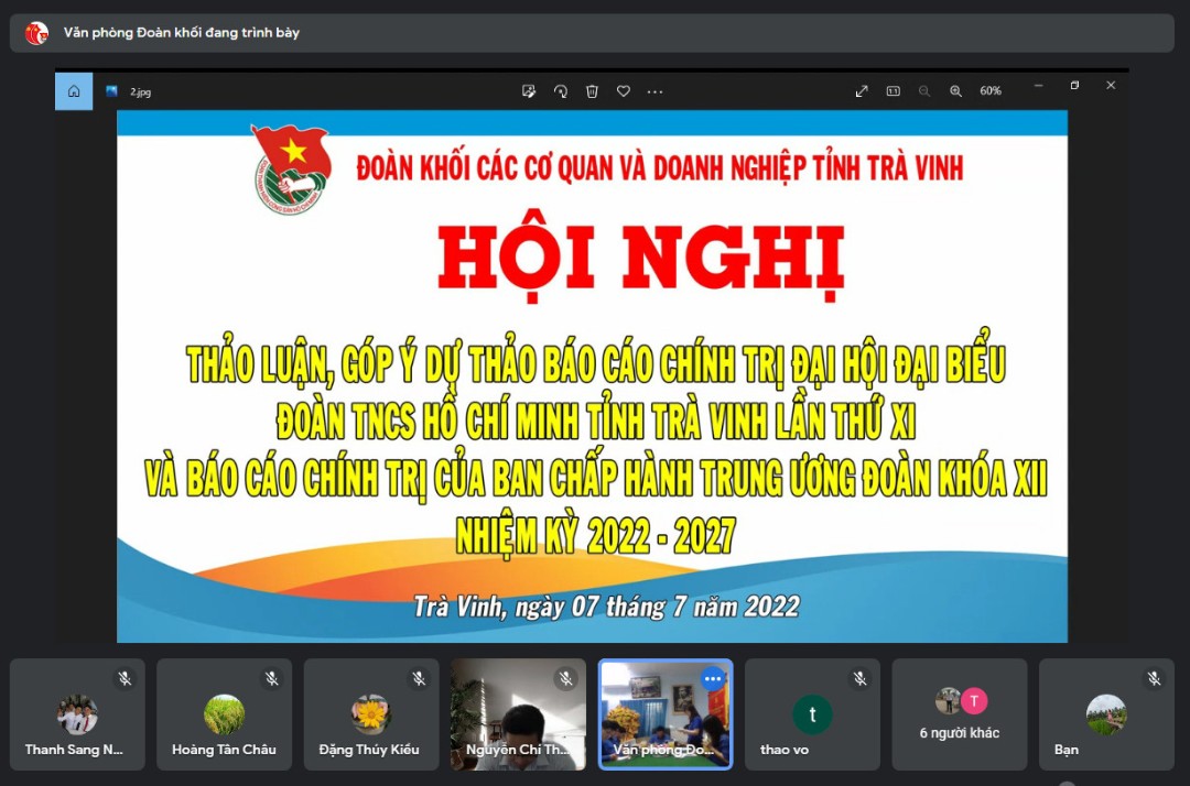 Ngày 7/7/2022, Ban Thường vụ Đoàn khối các cơ quan và doanh nghiệp tỉnh Trà Vinh tổ chức Hội nghị trực tuyến về việc “thảo luận, góp ý dự thảo báo cáo chính trị Đại hội đại biểu đoàn TNCS Hồ Chí Minh tỉnh Trà Vinh lần thứ XI và báo cáo chính trị của Ban Chấp hành Trung ương Đoàn khóa XII, nhiệm kỳ 2022 – 2027”. Tham dự Hội nghị có đồng chí Nguyễn Trọng Nhân – UVBTV Tỉnh đoàn, Bí thư Đoàn khối các cơ quan và doanh nghiệp tỉnh, các đồng chí UVBTV Đoàn khối và các đồng chí UVBCH Đoàn khối cùng hơn 50 cán bộ, đoàn viên, thanh niên, học sinh, sinh viên tại các điểm cầu cùng tham gia.