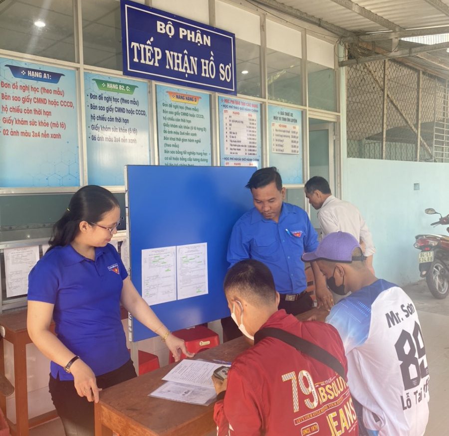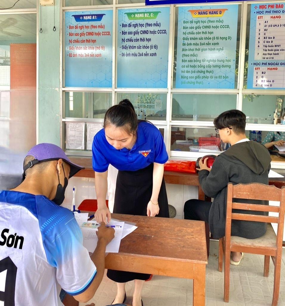 Tại đây, các bạn đoàn viên đã nhiệt tình tư vấn, hướng dẫn, giúp đỡ người dân đến nộp hồ sơ đăng ký thi Giấy phép lái xe. Bên cạnh đó, đoàn viên thanh viên còn hướng dẫn người dân cách ghi đơn, biên bản tổng hợp kết quả sát hạch lái xe đảm bảo đầy đủ, chính xác các thông tin một cách nhanh gọn. Đồng thời, giải đáp những khó khăn, vướng mắt trong quá trình thực hiện của người dân