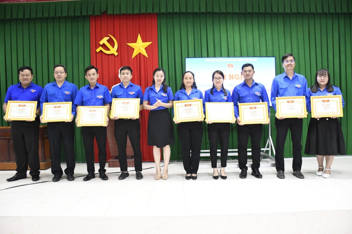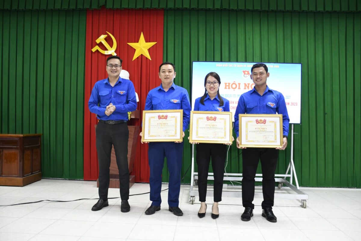Đồng chí Lữ Công Tạo (thứ ba trái qua) – Phó Bí thư Đảng ủy khối và đồng chí Nguyễn Trọng Nhân (thứ ba từ phải qua) trao tặng bằng khen của Ban Chấp hành Tỉnh đoàn cho các tập thể có thành tích xuất sắc trong công tác Đoàn và phong trào thanh thiếu nhi năm 2023