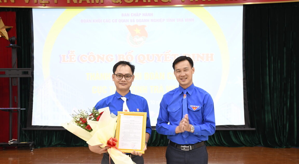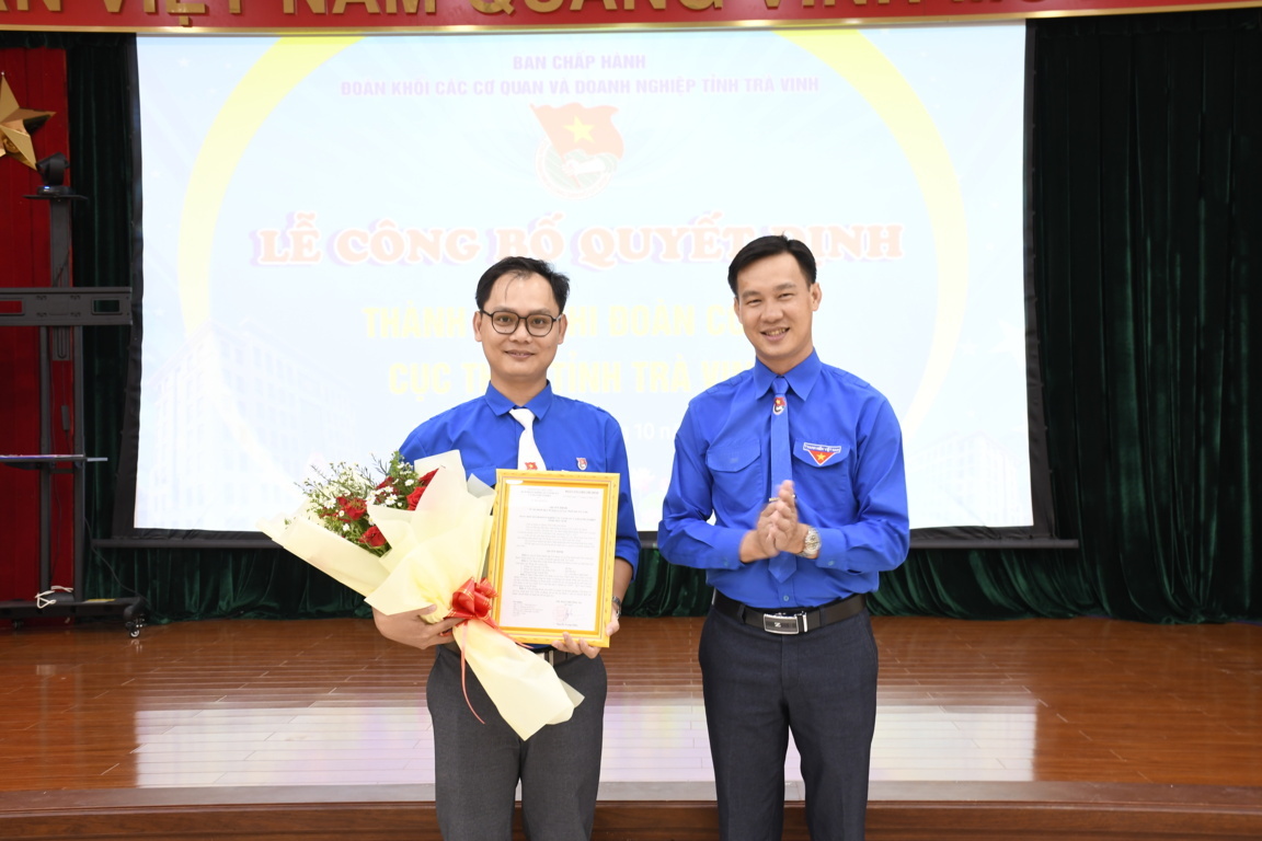 Đồng chí Nguyễn Trọng Nhân – Đảng ủy viên, UVBTV Tỉnh đoàn, Bí thư Đoàn khối trao quyết định thành lập Chi đoàn cơ sở Cục thuế Trà Vinh