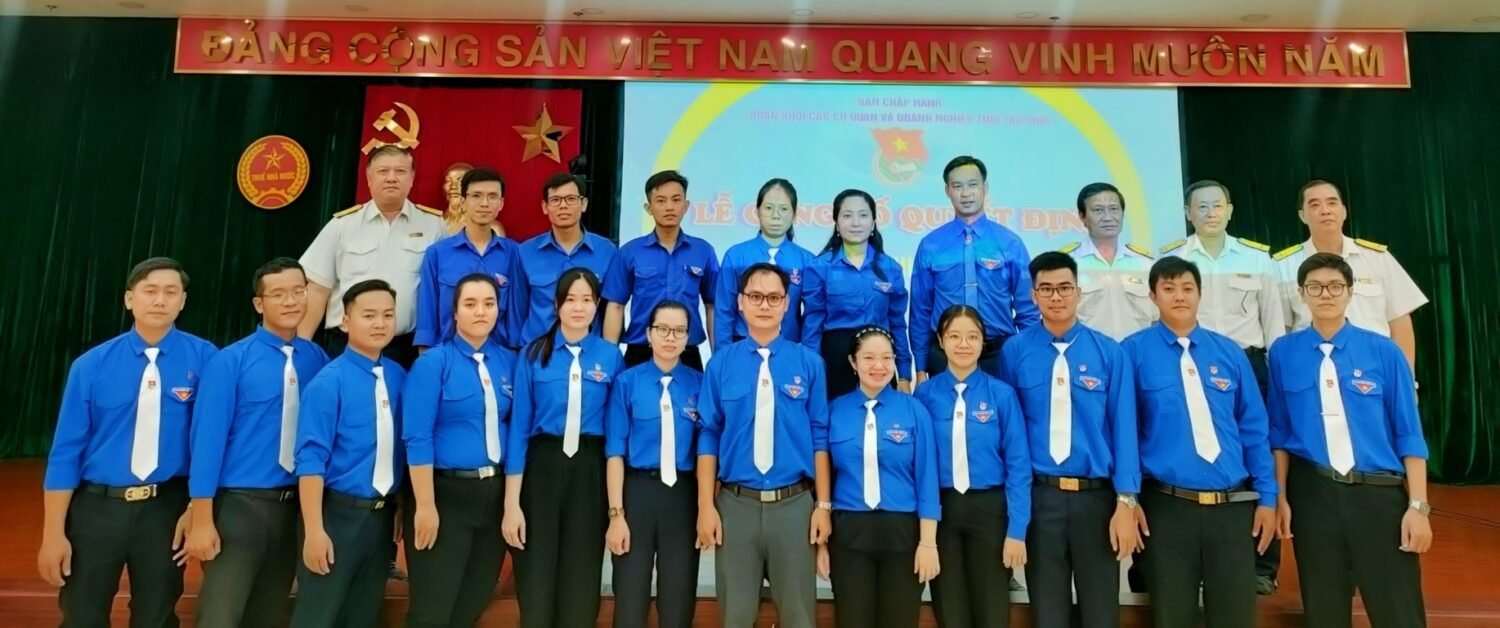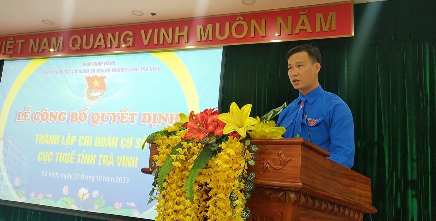 Chiều ngày 27/10/2023, tại Hội trường Cục thuế Trà Vinh. Ban Thường vụ Đoàn khối phối hợp Đảng ủy Cục thuế tổ chức lễ công bố trao quyết định thành lập Chi đoàn cơ sở Cục thuế Trà Vinh. Tham dự có các đồng chí: Dương Thị Yến Nhi – UVBTV, Trưởng ban Tổ chức – Kiểm tra Tỉnh đoàn; đồng chí Nguyễn Trọng Nhân – UVBTV Tỉnh đoàn, Bí thư Đoàn khối; đồng chí Trần Công Thành – Bí thư Đảng ủy Cục thuế tỉnh Trà Vinh; đồng chí Phạm Quốc Dũng – Cục trưởng Cục thuế Trà Vinh; đồng chí Nguyễn Văn Ngoan – Phó chủ tịch Công đoàn cơ sở Cục thuế tỉnh Trà Vinh; đồng chí Cao Văn Minh – Chủ tịch Hội cựu chiến binh Cục thuế tỉnh Trà Vinh; các đồng chí ủy viên BCH Đảng bộ Cục thuế; cùng các đồng chí trong Ban Thường vụ Đoàn khối; đoàn viên Chi đoàn Cục thuế cùng tham dự.