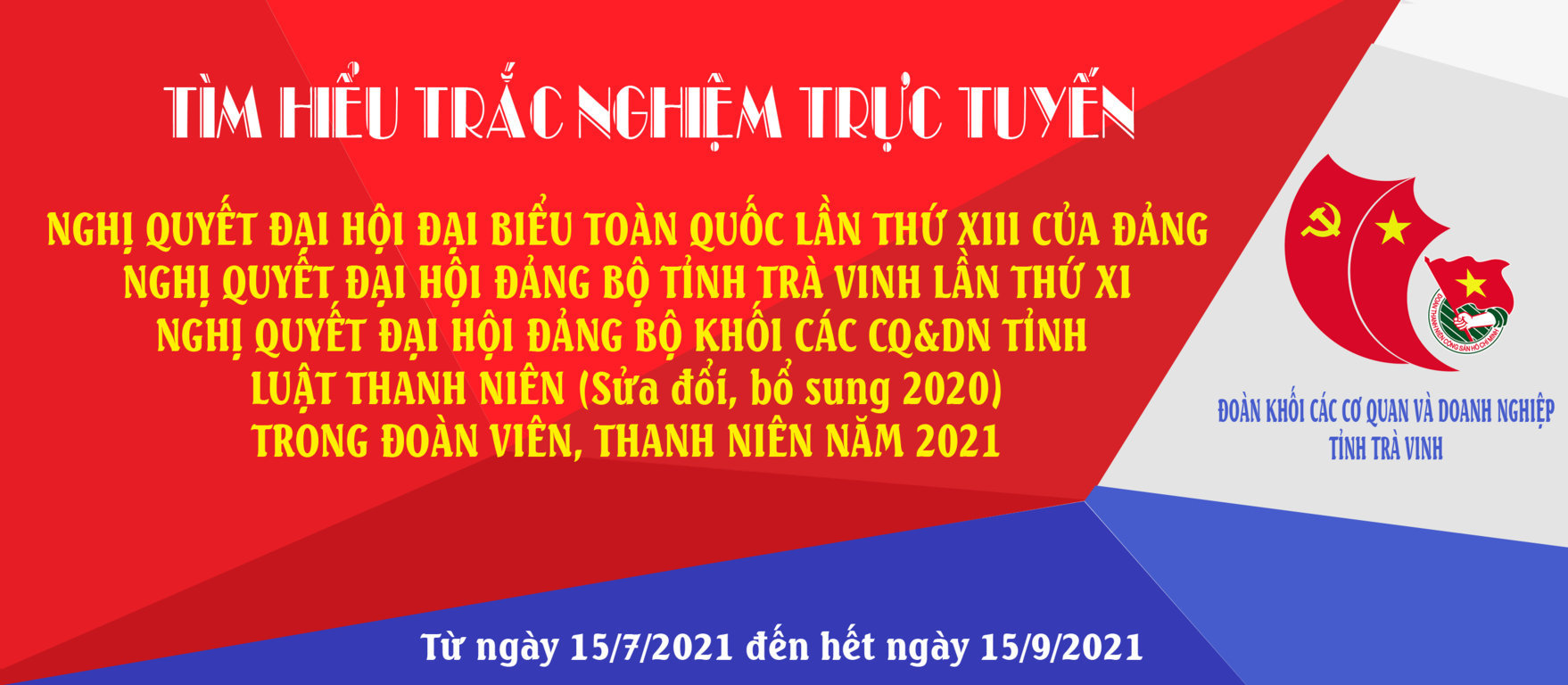 Từ ngày 15/7/2021 đến 15/9/2021, Ban Thường vụ Đoàn khối các cơ quan và doanh nghiệp tỉnh phát động hình thức “Tìm hiểu trắc nghiệm học tập trực tuyến Nghị quyết Đại hội Đảng các cấp nhiệm kỳ 2020 – 2025 và Luật Thanh niên (sửa đổi năm 2020) trong đoàn viên, thanh niên năm 2021” trong cán bộ, đoàn viên, thanh niên.