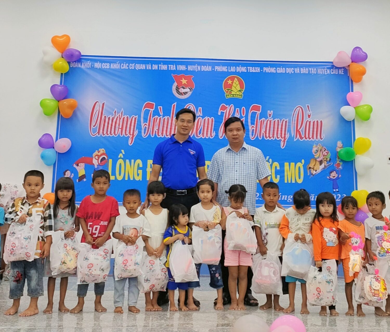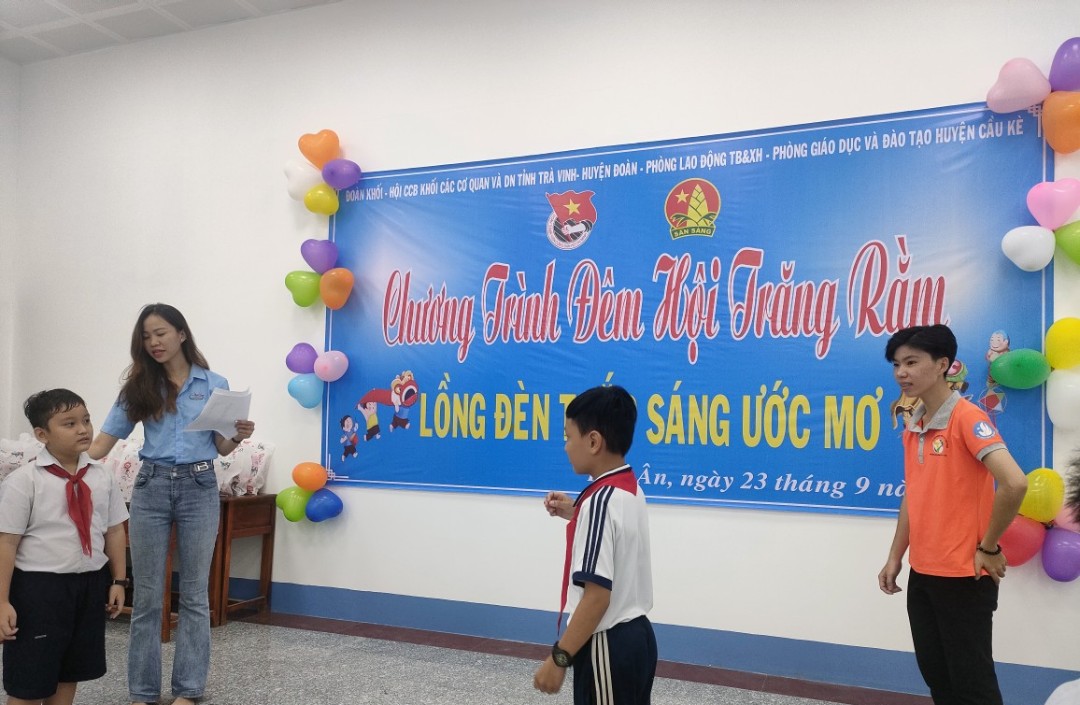 Tại đây, các em được thỏa thích tham gia các trò chơi do các anh chị đoàn viên, thanh niên hướng dẫn như: nhìn hình đón chữ, trò chơi tôi bảo,…cùng với các phần quà đặc sắc và hấp dẫn. Dịp này, Ban Thường vụ Đoàn khối đã phối hợp với Hội Cựu Chiến binh Đảng ủy khối, Huyện Đoàn Cầu Kè vận động các mạnh thường quân, nhà tài trợ trao tặng 150 phần quà gồm: bánh trung thu và lồng đèn (mỗi phần trị giá 150.000 đồng).