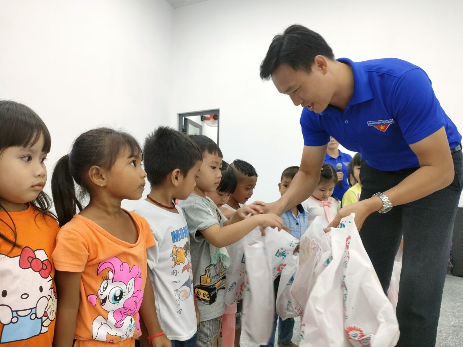 Đồng chí Nguyễn Trọng Nhân – Đảng ủy viên, UVBTV Tỉnh đoàn, Bí thư Đoàn khối trao qua cho các em thiếu nhi