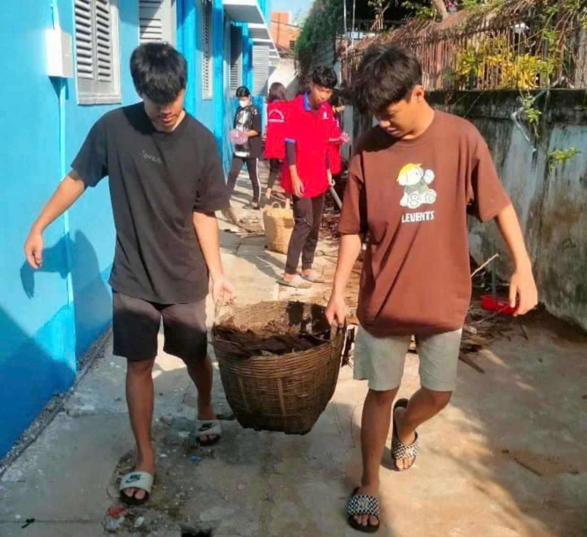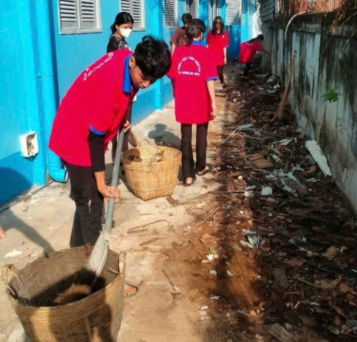 Tại đây, các bạn tình nguyện viên thực hiện các công trình, phần việc ý nghĩa như: Vệ sinh các khu vực trong và ngoài trường học, sắp xếp bàn ghế, chăm sóc cây xanh trong khuôn viên Trung tâm, thu gom rác thải; bóc xóa bảng quảng cáo trên tuyến đường Quang Trung, tp Trà Vinh,…