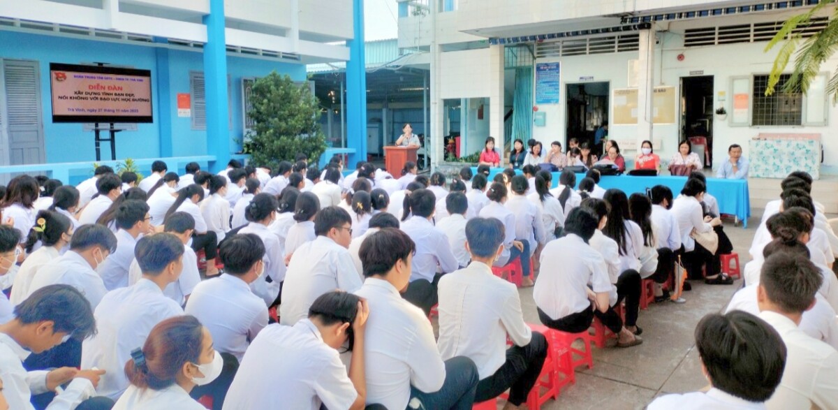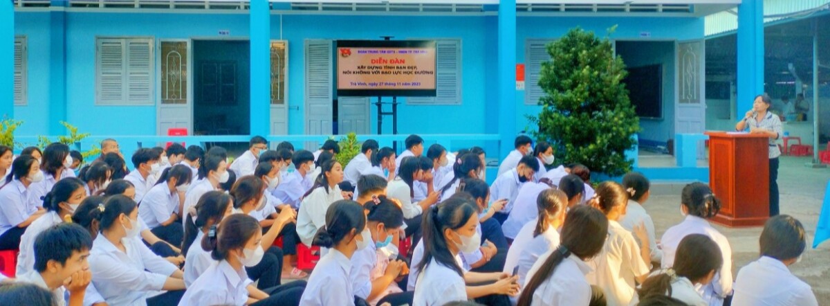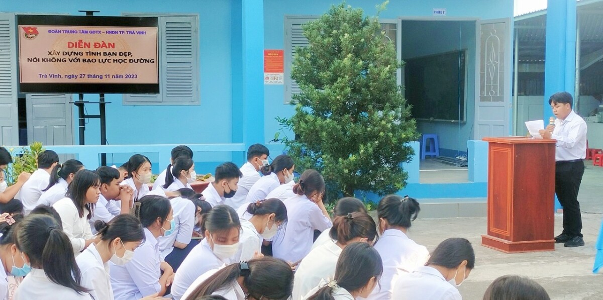 Sáng ngày 27/11/2023, Đoàn Trung tâm GDTX – HNDN TP.Trà Vinh tổ chức Diễn đàn “Xây dựng tình bạn đẹp – Nói không với bạo lực học đường” năm học 2023 – 2024. Đến tham dự có Cô Nguyễn Thừa Xuân Thảo – Phó Giám đốc Trung tâm, BCH Đoàn Trung tâm; giáo viên và hơn 300 học viên của Trung tâm cùng tham dự.