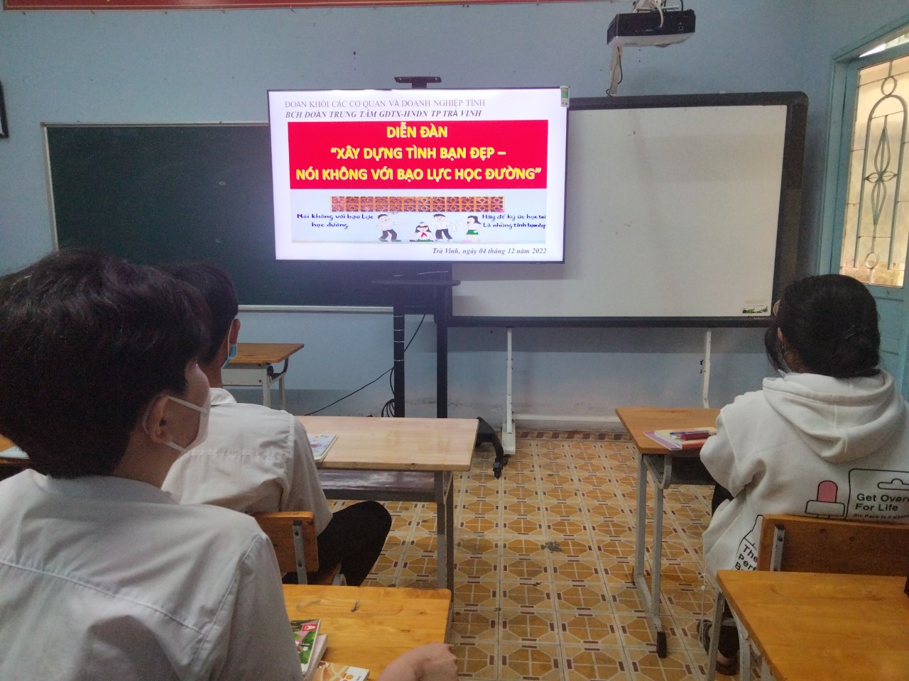 Thực hiện Chương trình công tác Đoàn và phong trào Thanh niên trường học năm học 2022 – 2023, sáng ngày 4/12/2022, Đoàn Trung tâm GDTX – HNDN TP Trà Vinh tổ chức Diễn đàn “Xây dựng tình bạn đẹp – Nói không với bạo lực học đường” năm học 2022 – 2023. Đến tham dự Diễn đàn có sự góp mặt của các đồng chí trong Ban Thường vụ Đoàn trường, quý thầy, cô và trên 50 học viên của Trung tâm cùng tham dự. Đây là Diễn đàn lần thứ 02 được Ban Chấp hành Đoàn Trung tâm tổ chức trong năm học này.