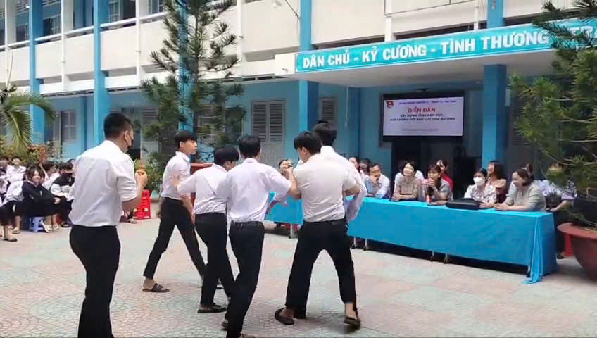Tại đây, các em học viên đã được xem tiểu phẩm về “tình bạn trong môi trường học đường” do các bạn đoàn viên đến thừ Chi đoàn 12.3 biểu diễn. Tiểu phẩm này không chỉ mang đến những giây phút giải trí, mà còn chứa đựng những thông điệp sâu sắc về tình bạn chân thành, sự đoàn kết, và cách ứng xử trong môi trường học đường. Qua đó, các em học viên được nhìn nhận rõ hơn về những giá trị tốt đẹp của tình bạn trong học đường, đồng thời hiểu rằng mỗi cá nhân cần có trách nhiệm bảo vệ và xây dựng môi trường học tập an toàn, lành mạnh, không có bạo lực.