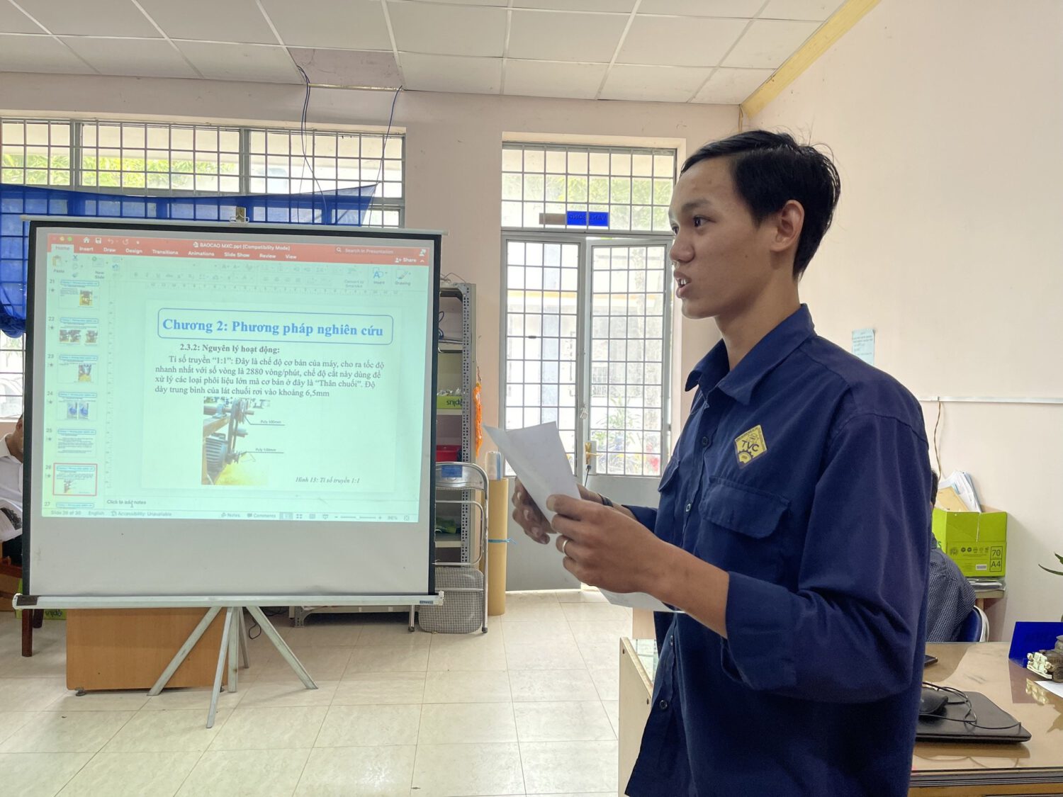 Cụ thể, Đoàn trường đã thành lập CLB Nghiên cứu ứng dụng và kỹ năng nghề cho HSSV của khoa cơ khí động lực, với 20 thành viên. Đồng thời, Đoàn trường đã phối hợp Giảng viên trường hỗ trợ cơ sở vật chất, thiết bị, kĩ thuật để các bạn sinh viên trong CLB chế tạo ra sản phẩm “Thiết kế-chế tạo cải tiến máy xắt thân cây chuối”. Sau thời gian nghiên cứu, gia công và thử nghiệm sản phẩm đã được đưa vào sử dụng và đạt hiệu quả cao. Sản phẩm giúp cho người dân an toàn hơn trong việc chế biến thức ăn cho gia súc, gia cầm, giảm thiểu thời gian, công sức và tăng hiệu quả kinh tế.