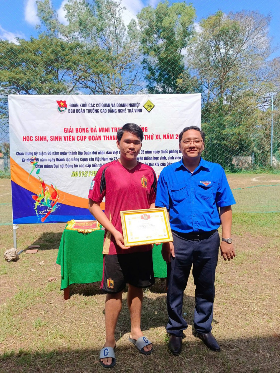 Đ/c Nguyễn Chí Linh – Bí thư Đoàn trường Đoàn trường Cao đẳng nghề Trà Vinh tặng giấy khen cho vận động viên Phan Minh Phát lớp CĐ5 -KTML-24(9+) đạt danh hiệu thủ môn xuất sắc nhất