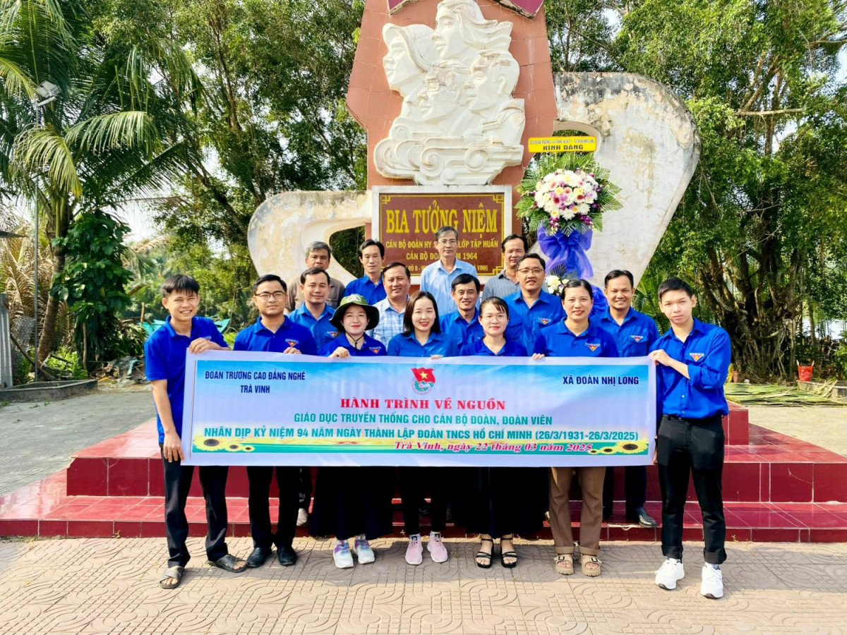 Thiết thực lập thành tích chào mừng kỷ niệm 94 năm Ngày thành lập Đoàn TNCS Hồ Chí Minh (26/3/1931 – 26/3/2025). Ngày 22/3/2025, Ban Thường vụ Đoàn Trường Cao đẳng Nghề Trà Vinh phối hợp với Xã Đoàn Nhị Long tổ chức hành trình giáo dục truyền thống “về với địa chỉ đỏ” cho cán bộ, đoàn viên, thanh niên tại Bia tưởng niệm cán bộ Đoàn đã hy sinh trong lớp huấn luyện cán bộ Đoàn năm 1964 tại ấp Rạch Rô 2, xã Nhị Long, huyện Càng Long.