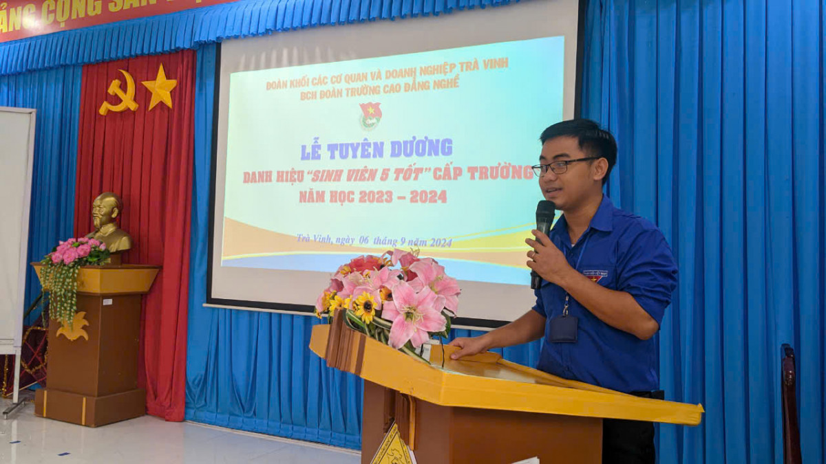 Ngày 06/9/2024, Ban Chấp hành Đoàn Trường Cao đẳng Nghề Trà Vinh tổ chức tuyên dương danh hiệu “Sinh viên 5 tốt” cấp trường năm học 2023 – 2024 cho 15 sinh viên có thành tích xuất sắc trong hoạt động công tác đoàn và phong trào thanh thiếu niên.