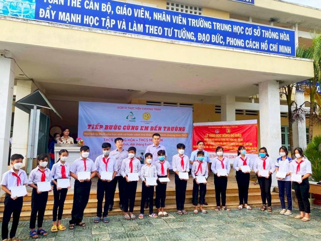 Ngoài ra, Đoàn trường phối hợp với Công ty Cổ phần Dược phẩm Trà Vinh (TV.Pharm): Hỗ trợ học sinh nghèo 02 xã Hòa Ân, Thông Hòa với mức hỗ trợ đối với học sinh khó khăn 230.000 đồng/tháng; học sinh thuộc hộ cận nghèo 250.000 đồng/tháng; học sinh thuộc hộ nghèo 300.000 đồng/tháng.